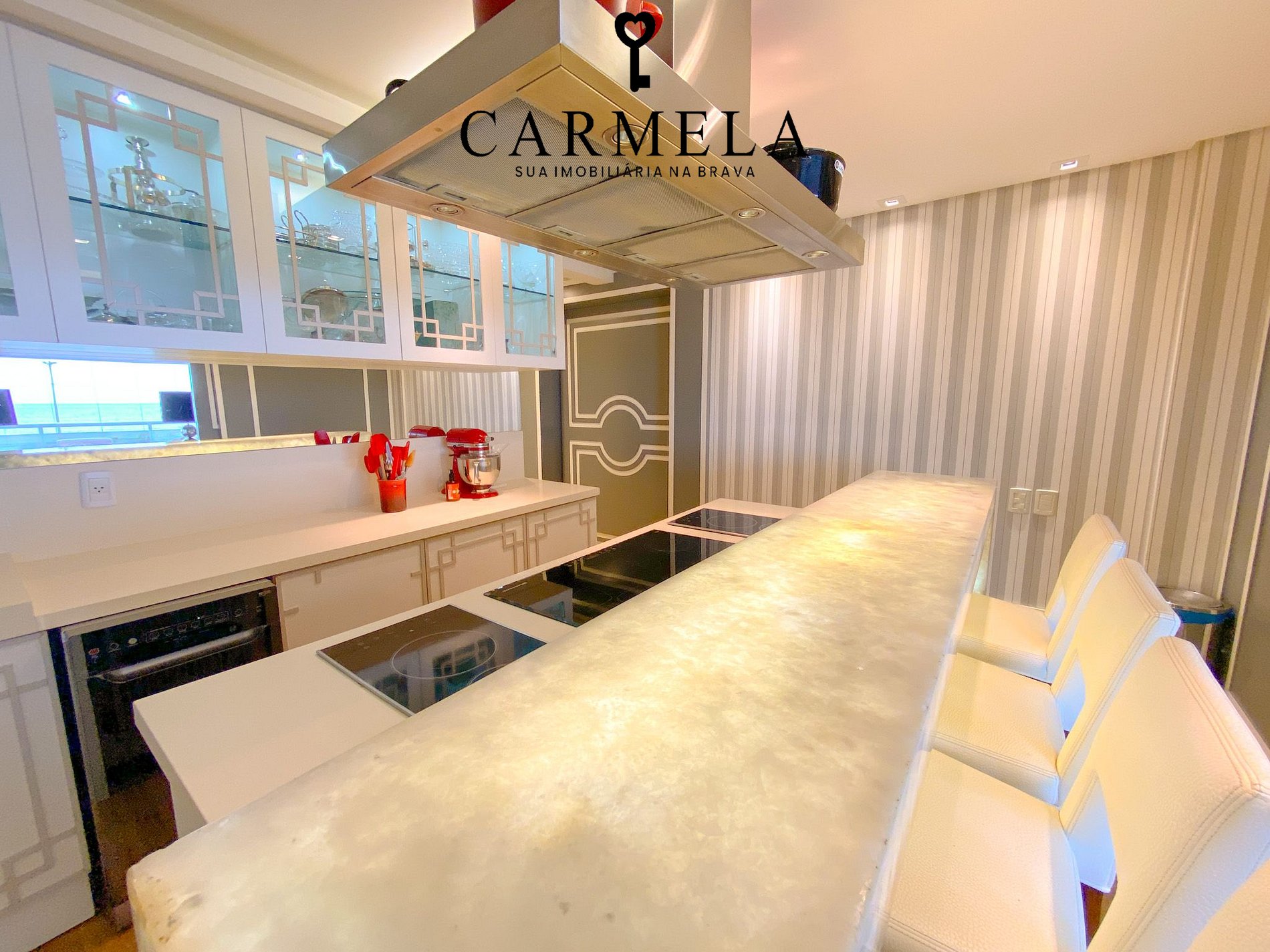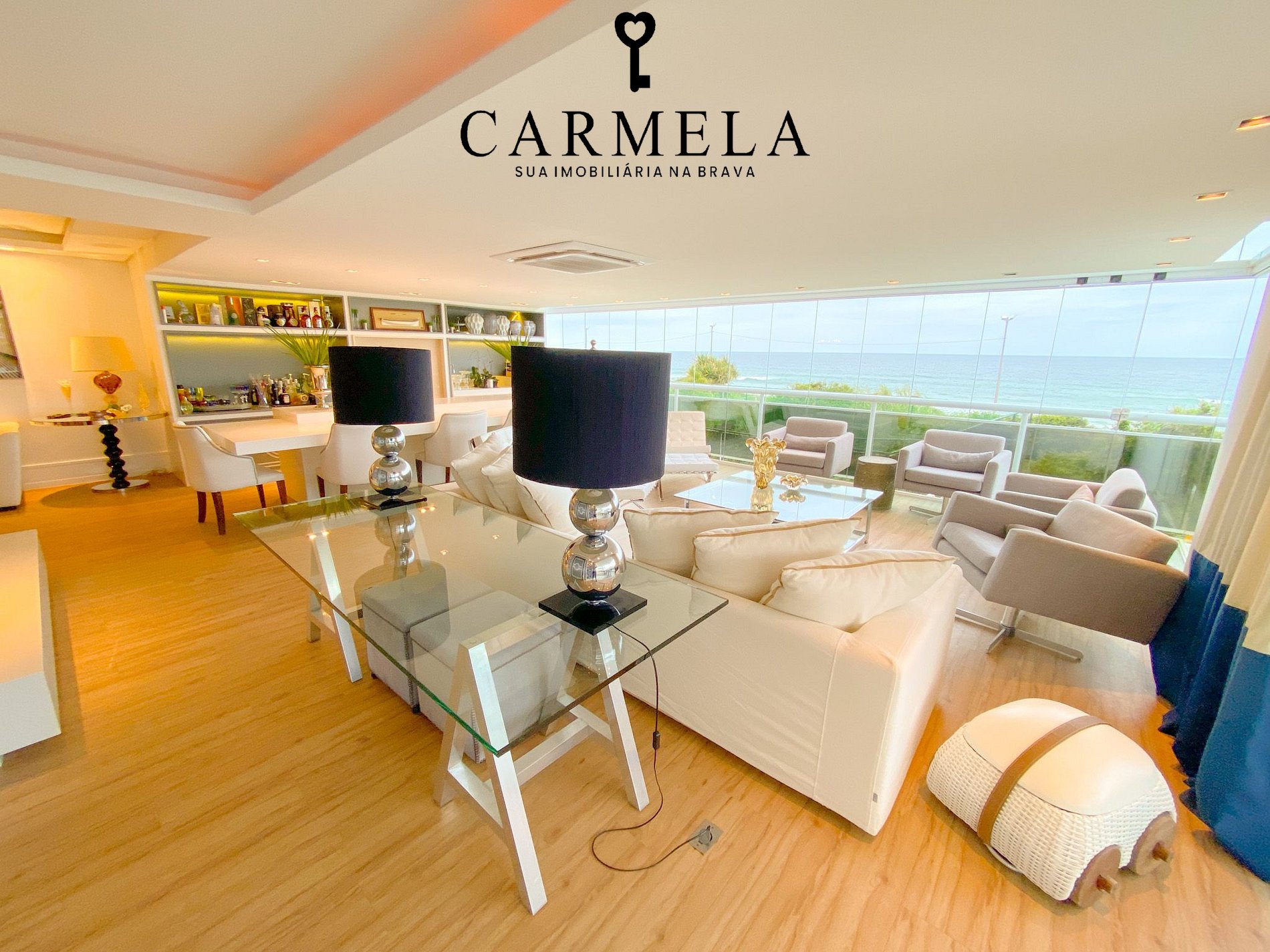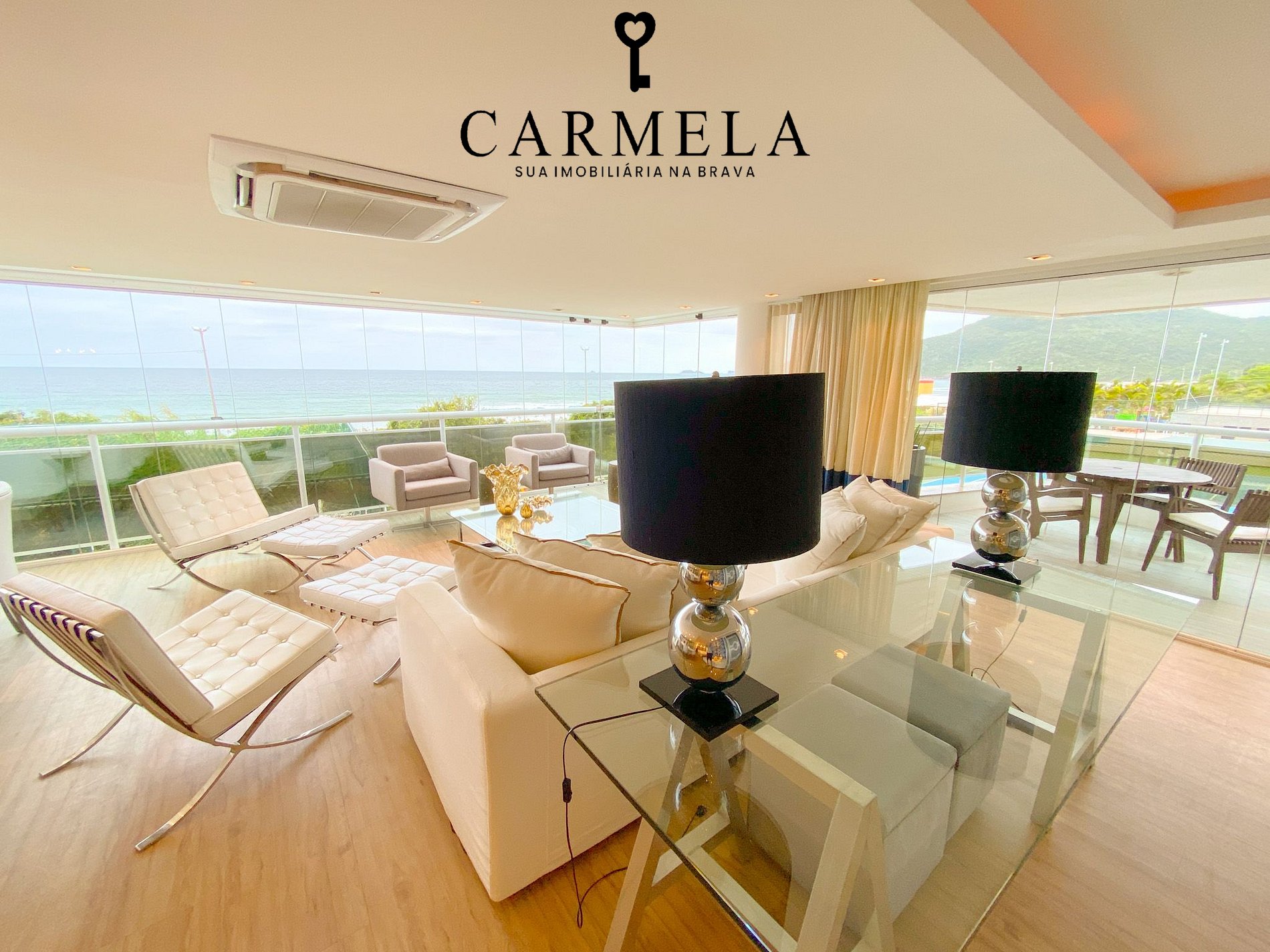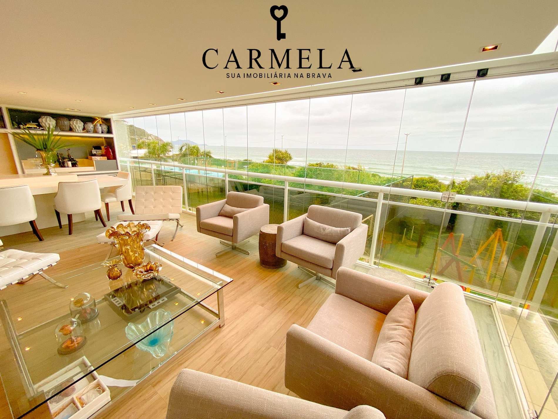 Sacada fechada com churrasqueira de frente para o mar.