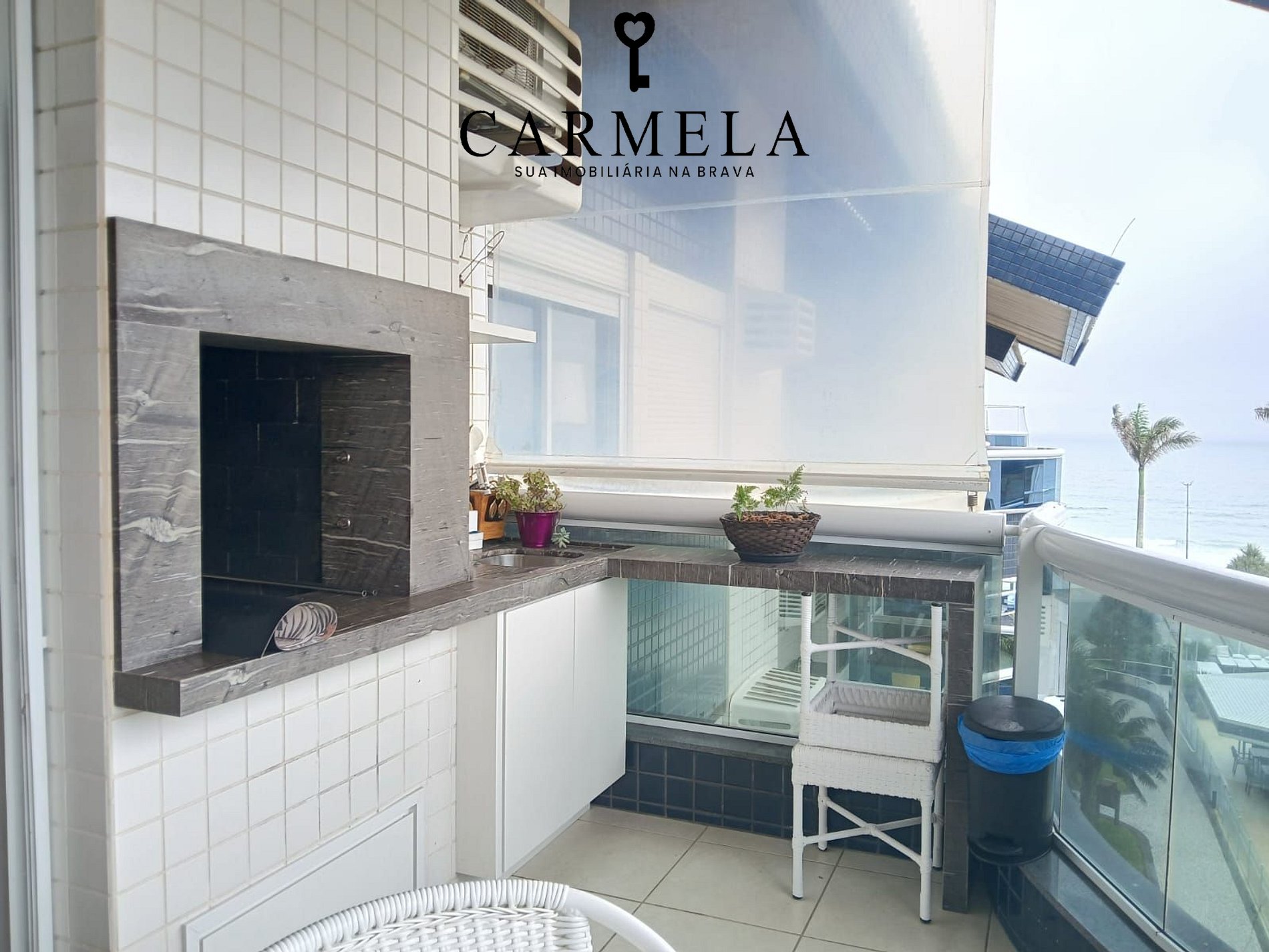 Sacada com churrasqueira e vista lateral para o mar.