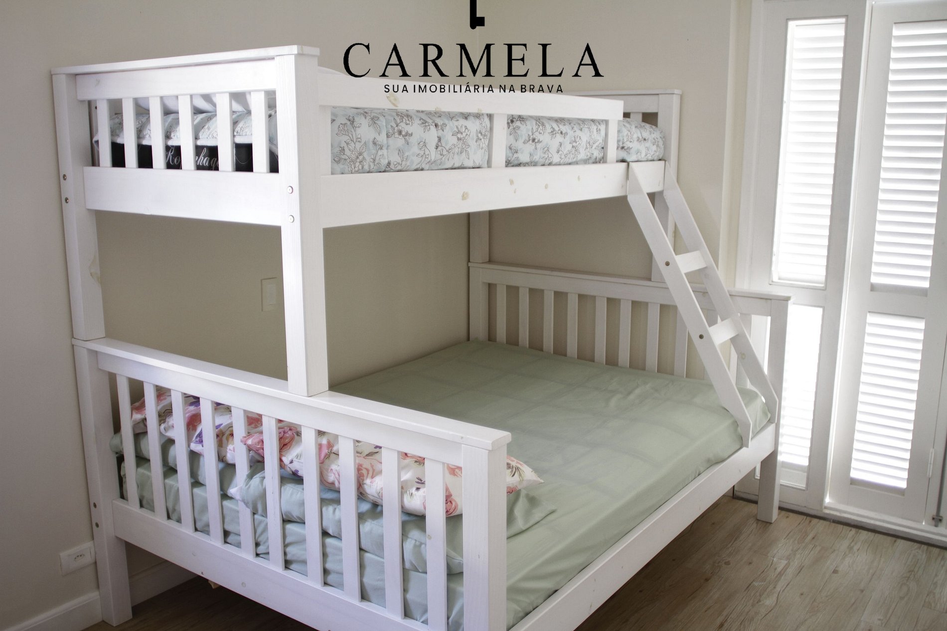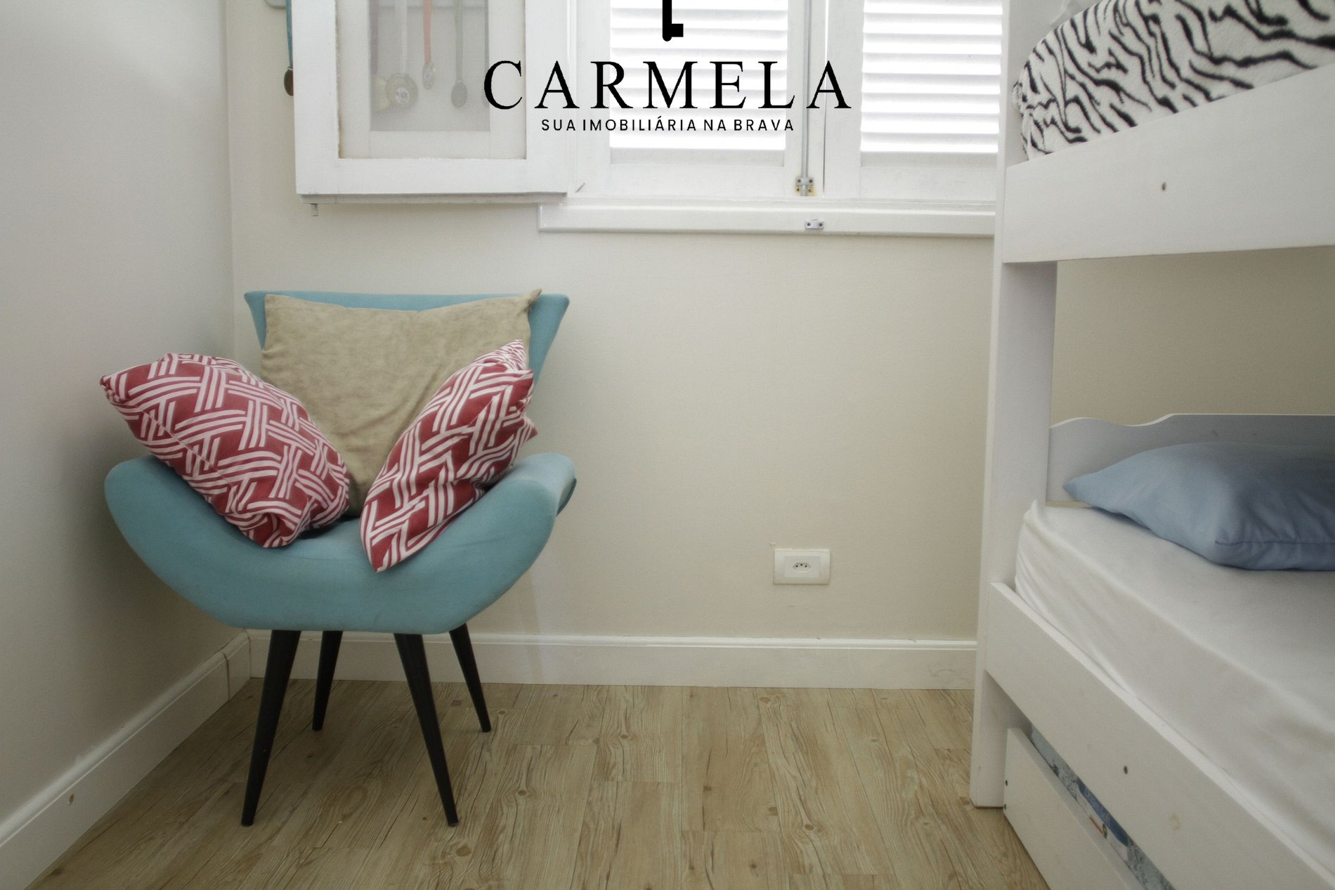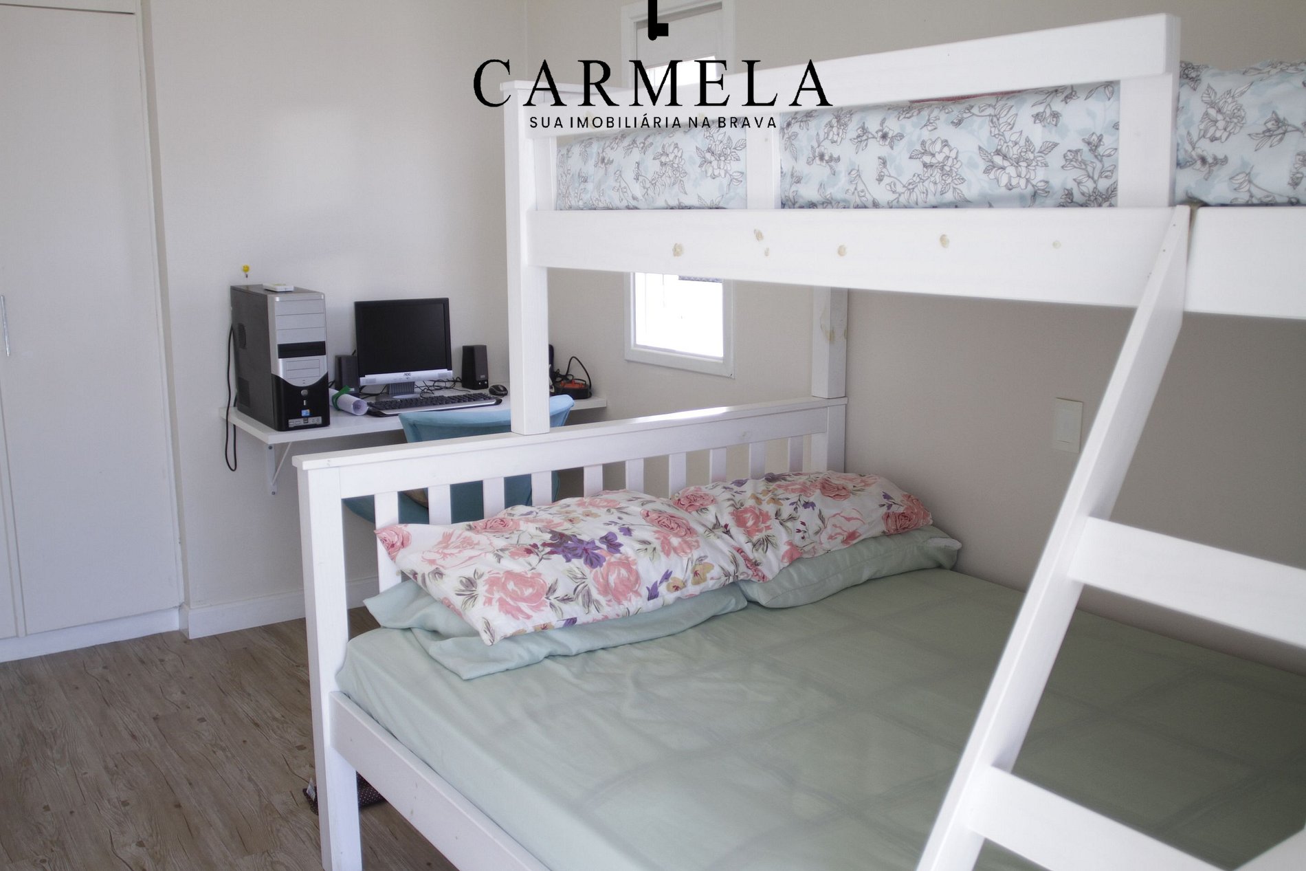 Dormitório, com 1 beliche com cama de casal na parte de baixo.