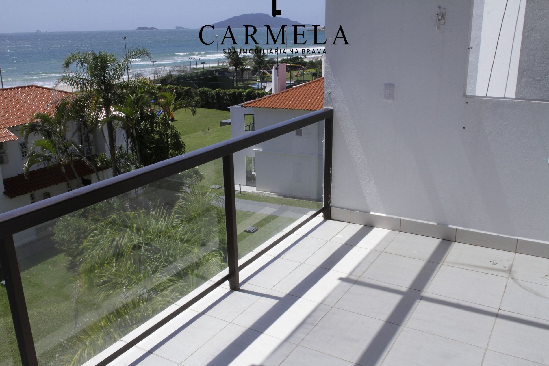 Sacada com churrasqueira e vista para o mar.