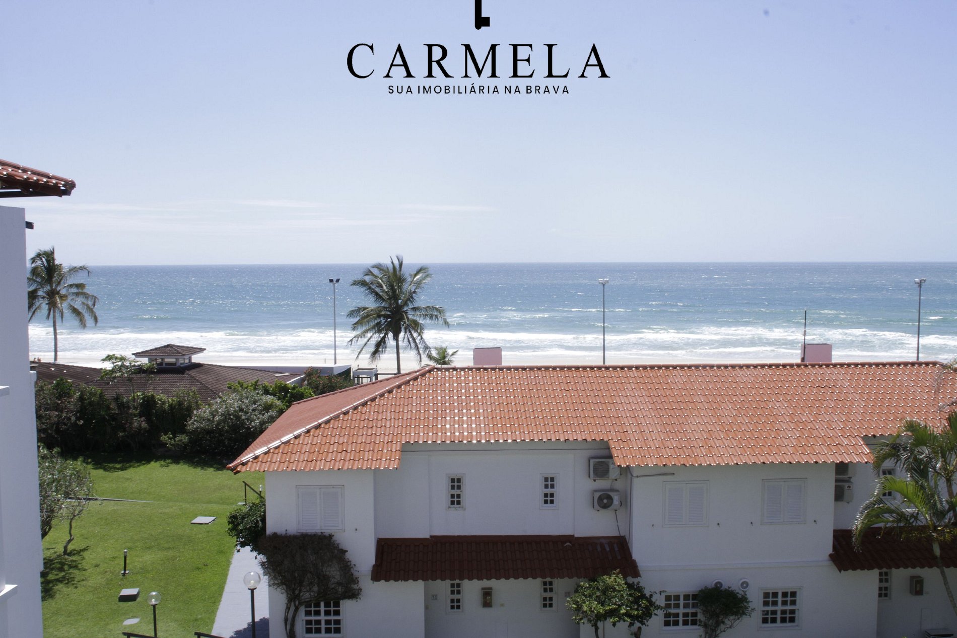 Condomínio de frente para a praia, com piscina, área verde e quadra de tênis.