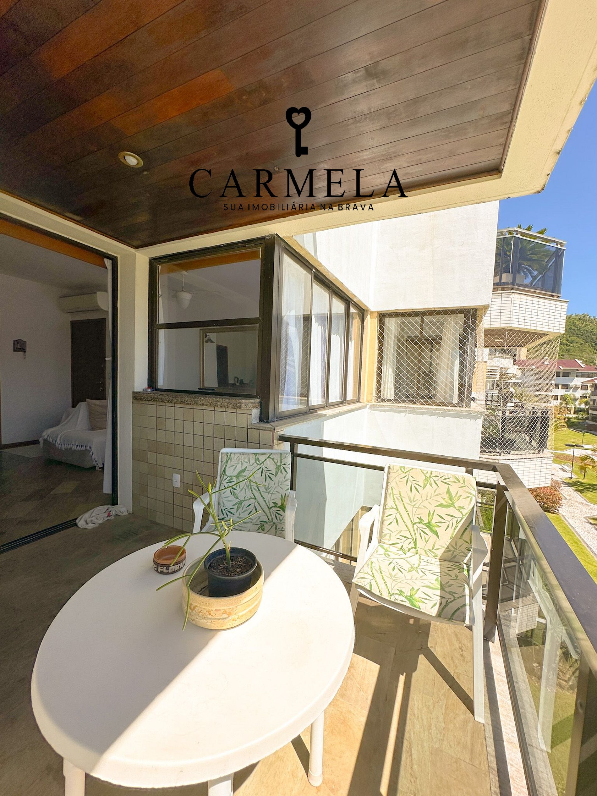 Sacada com churrasqueira e vista lateral para o mar.