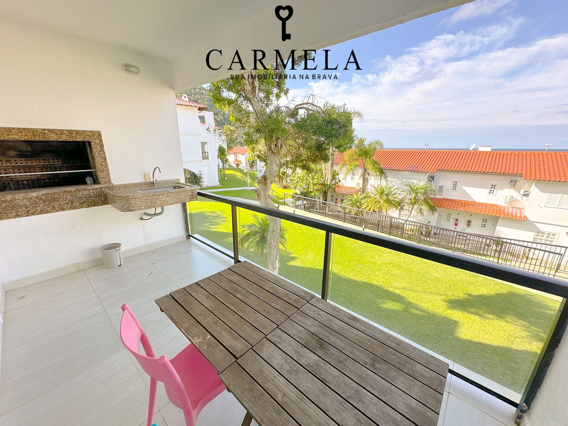 Possui sacada com churrasqueira e vista para o mar.