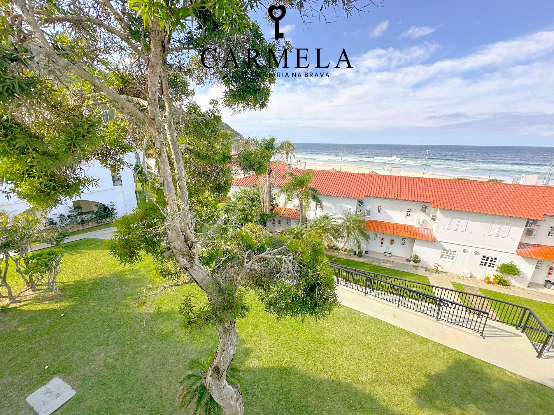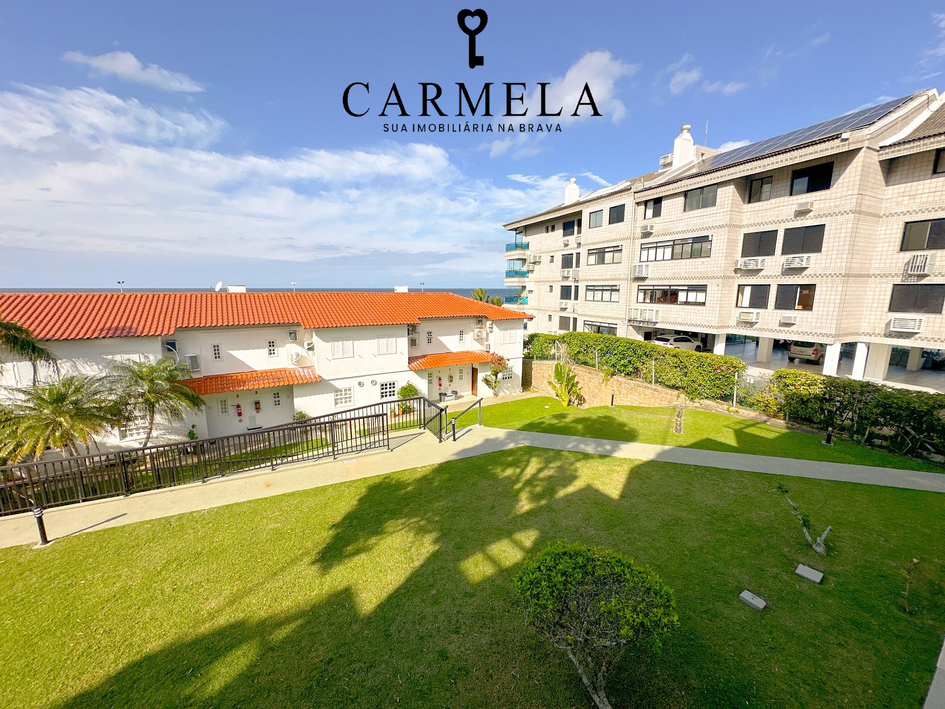 Condomínio de frente para a praia, com piscina, área verde e quadra de tênis.