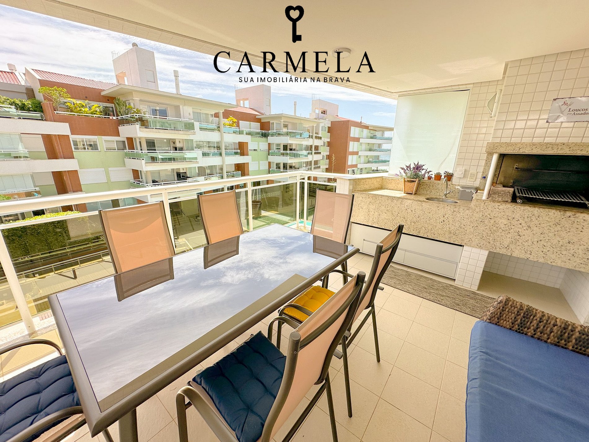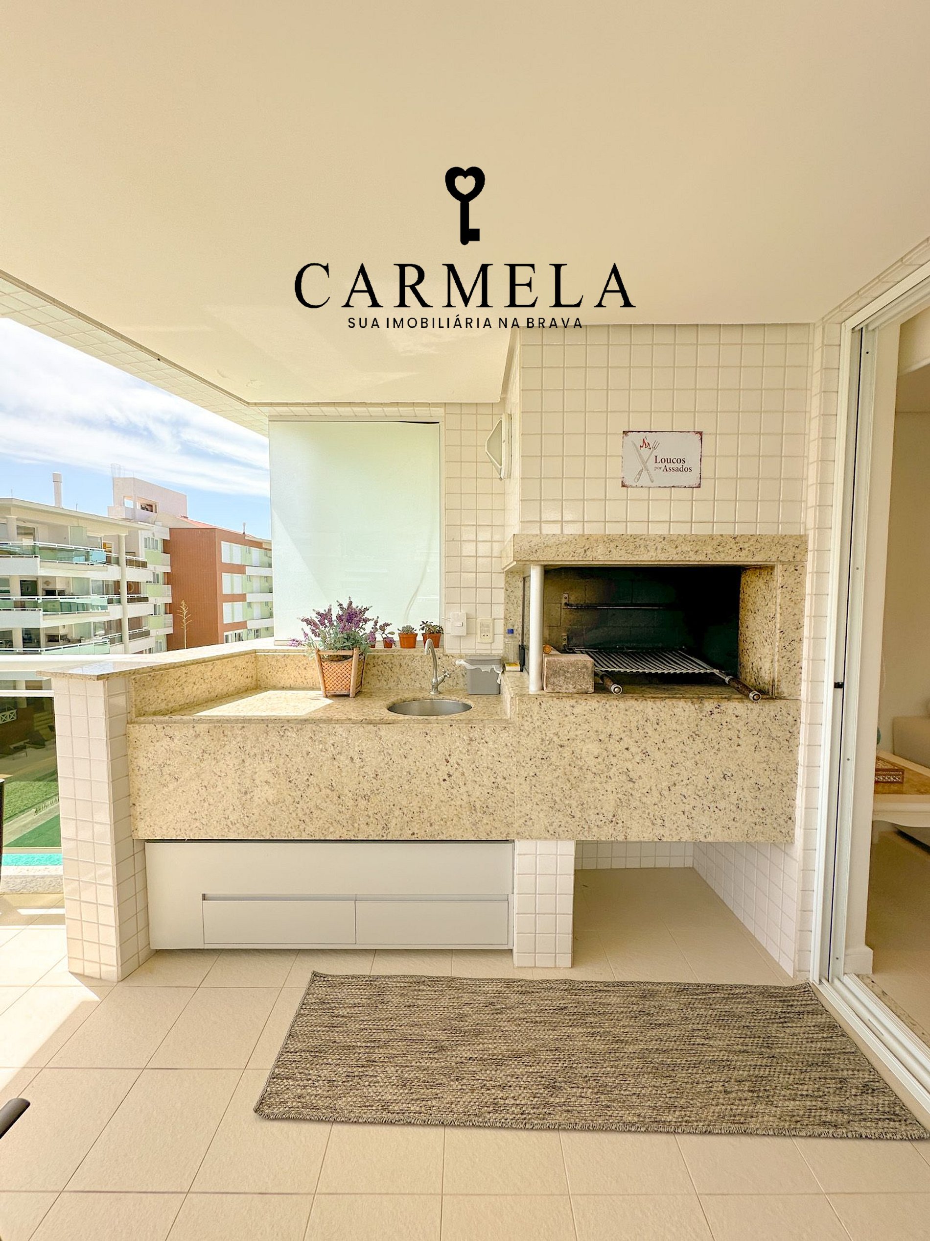 Sacada com churrasqueira e vista lateral para o mar.