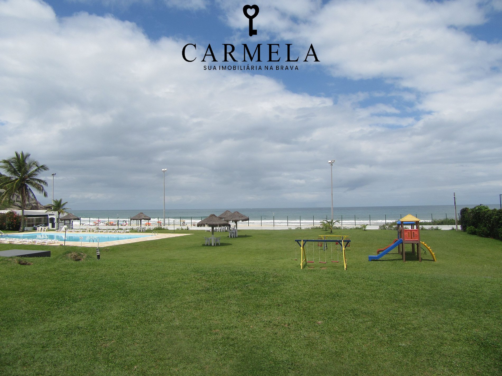 Condomínio de frente para a praia, com piscina, área verde e quadra de tênis.