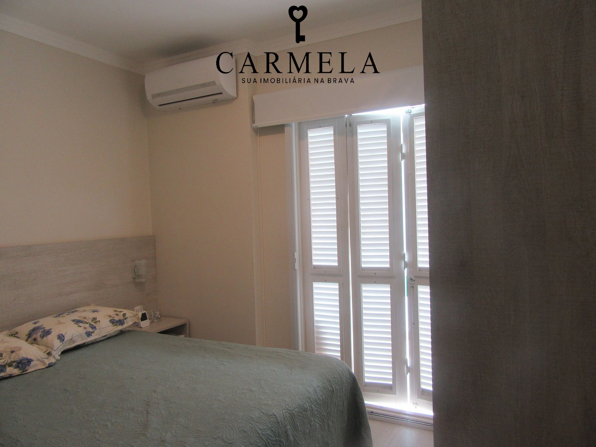 Suíte casal com ar condicionado e varanda.
