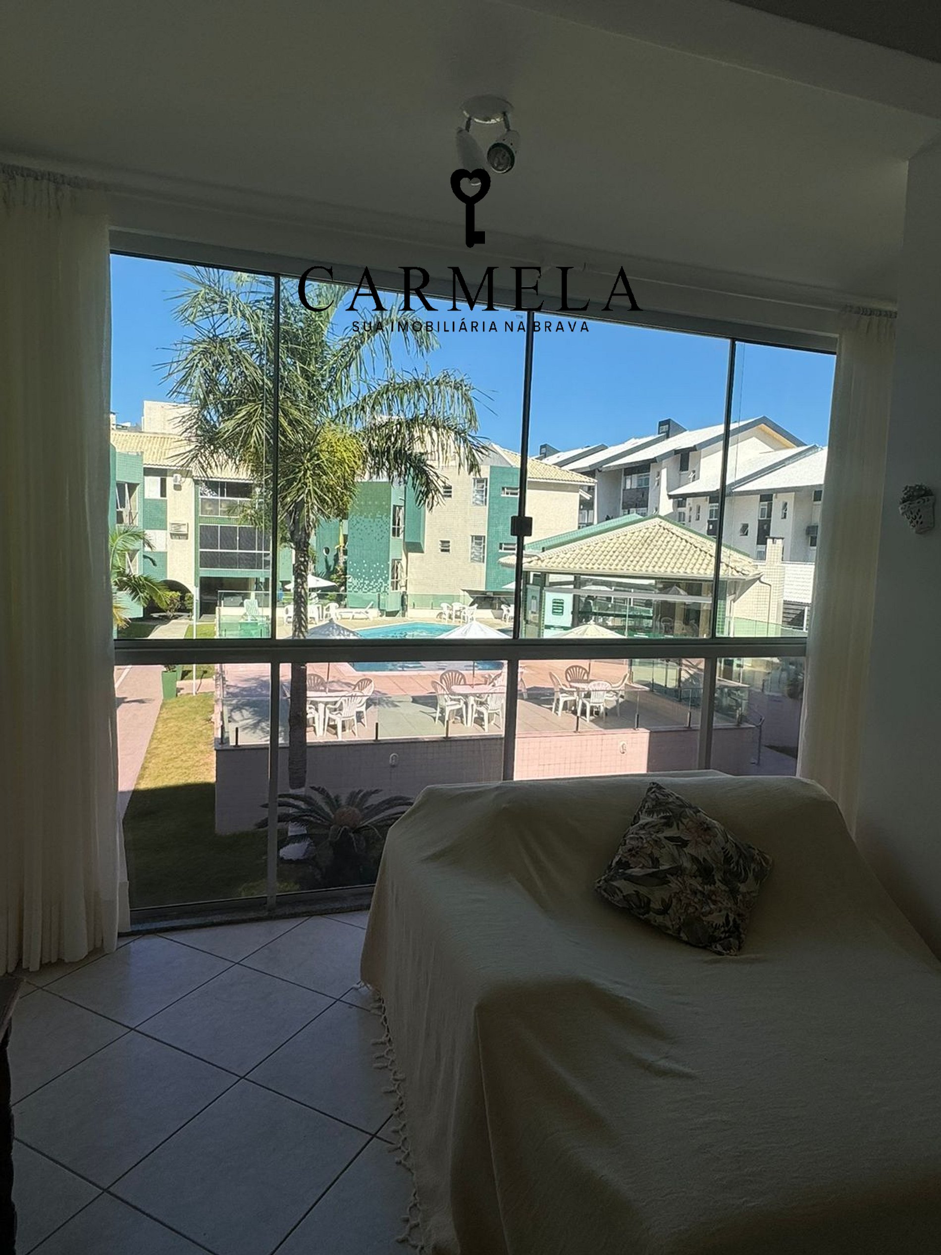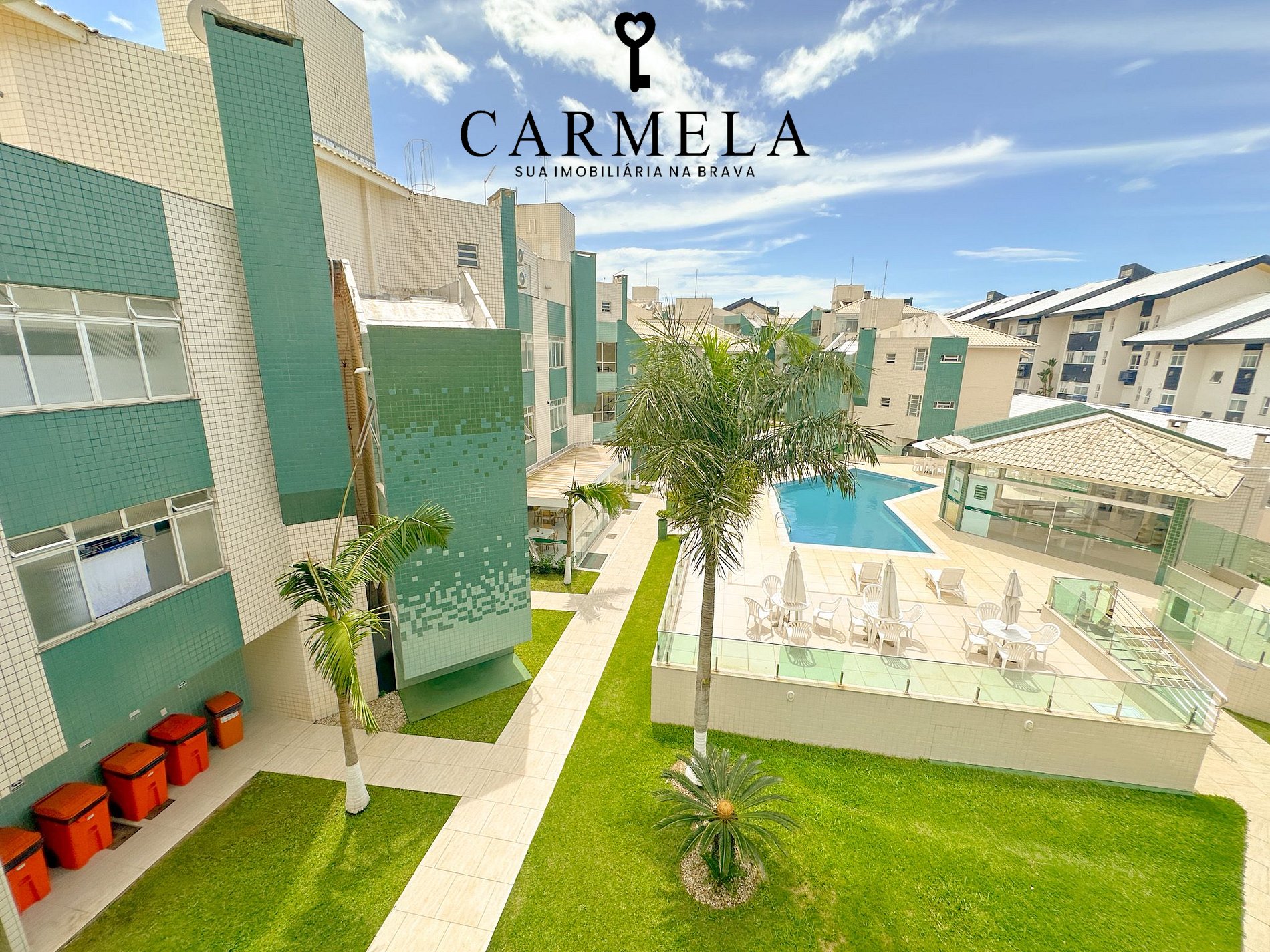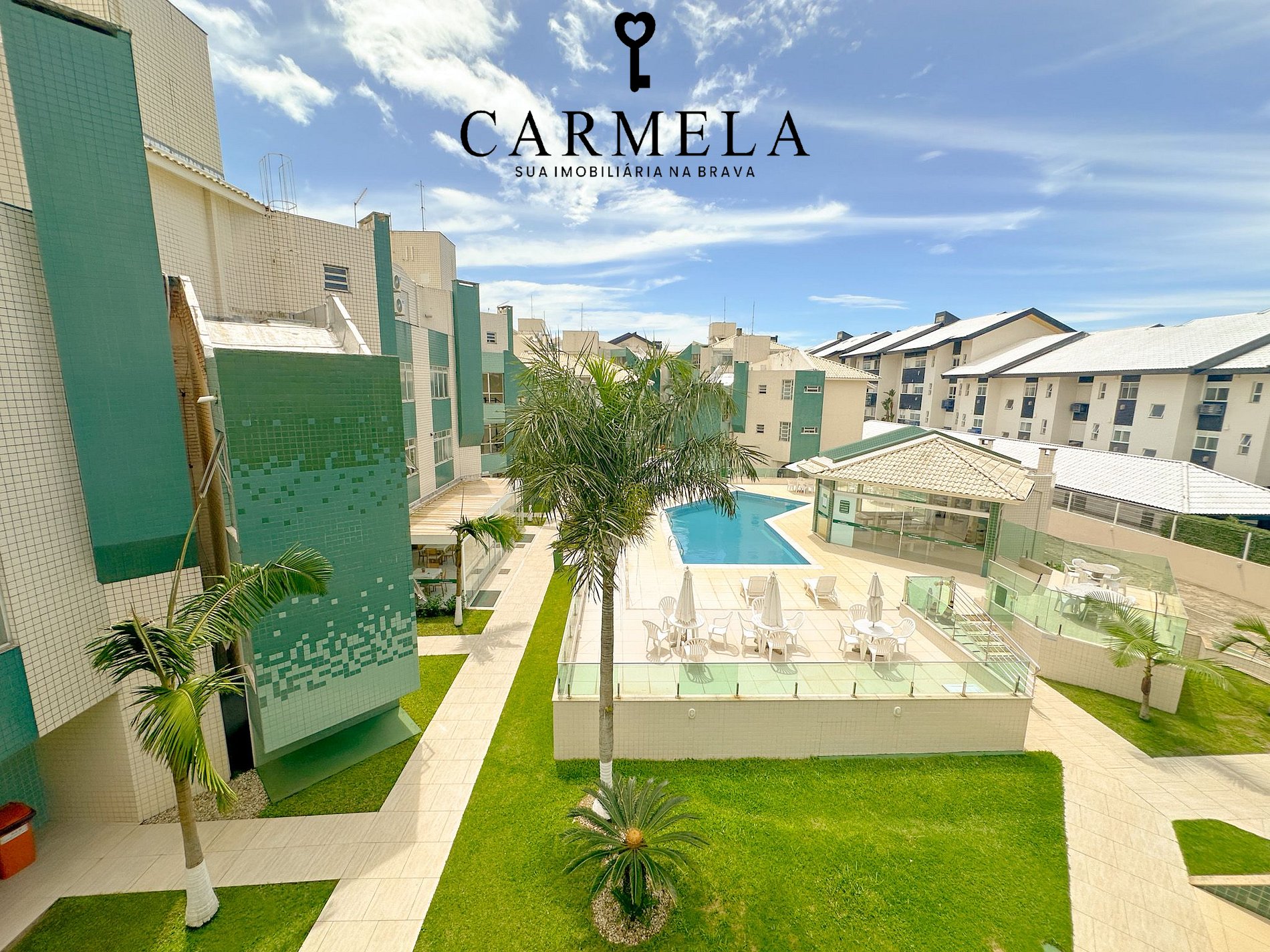 Condomínio com piscina, na quadra da praia.