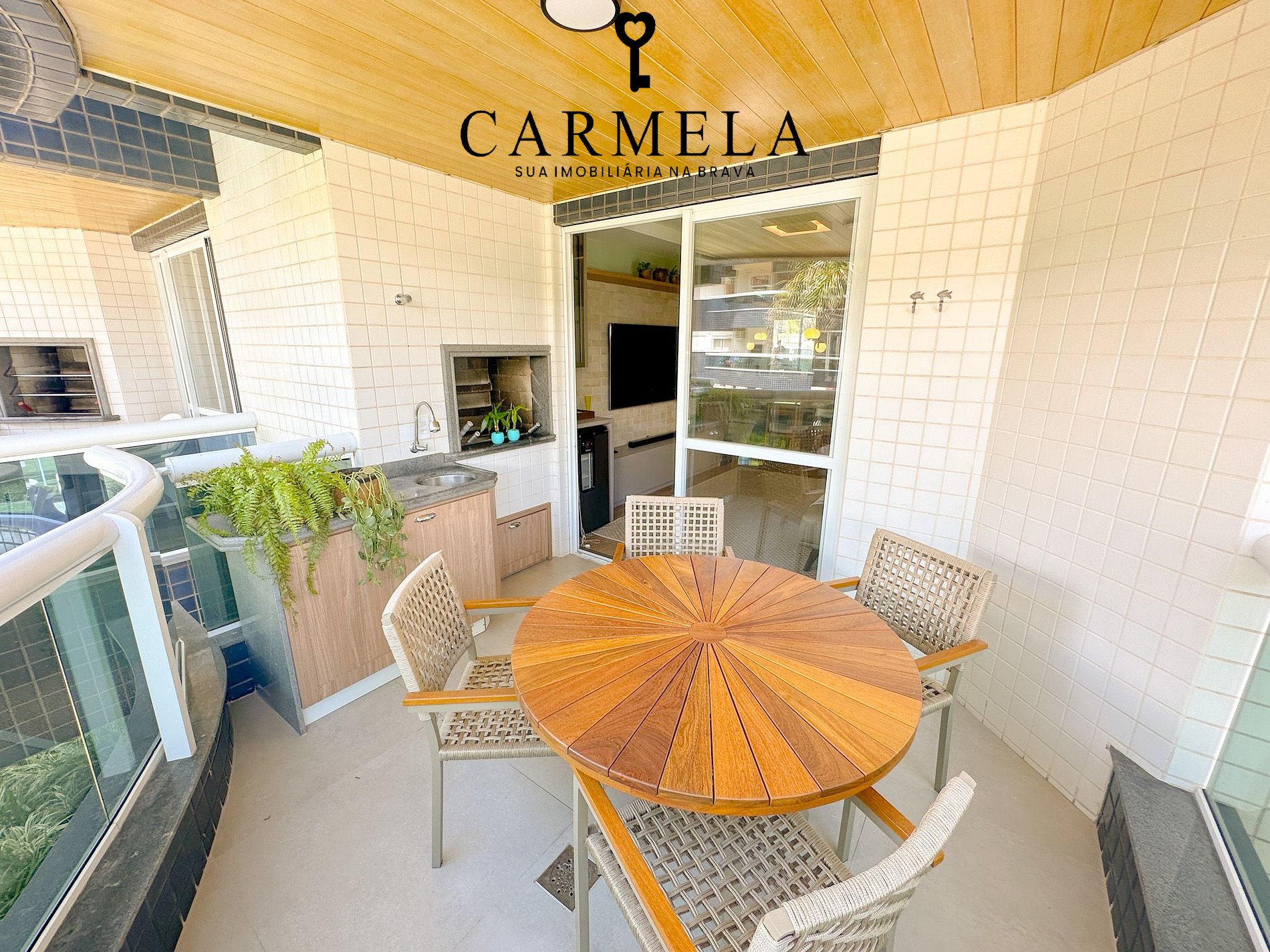 Sacada com churrasqueira. Vista lateral para o mar.