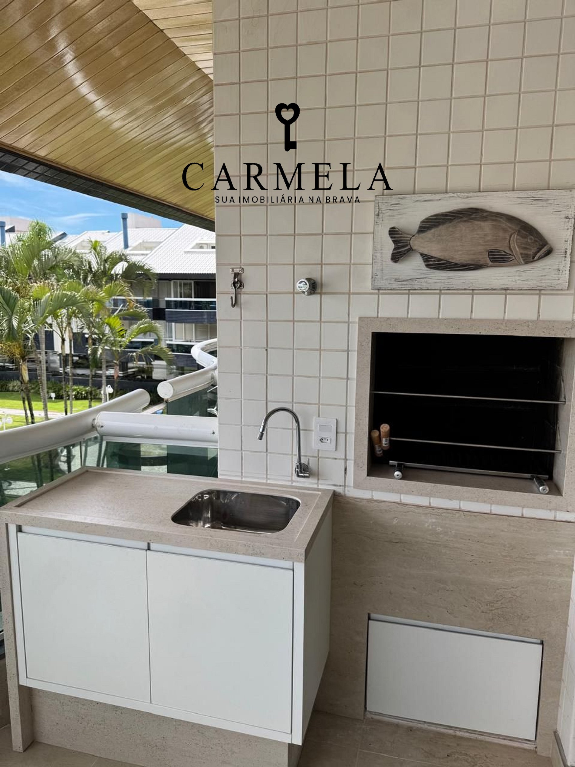 Sacada com churrasqueira e vista para o jardim.