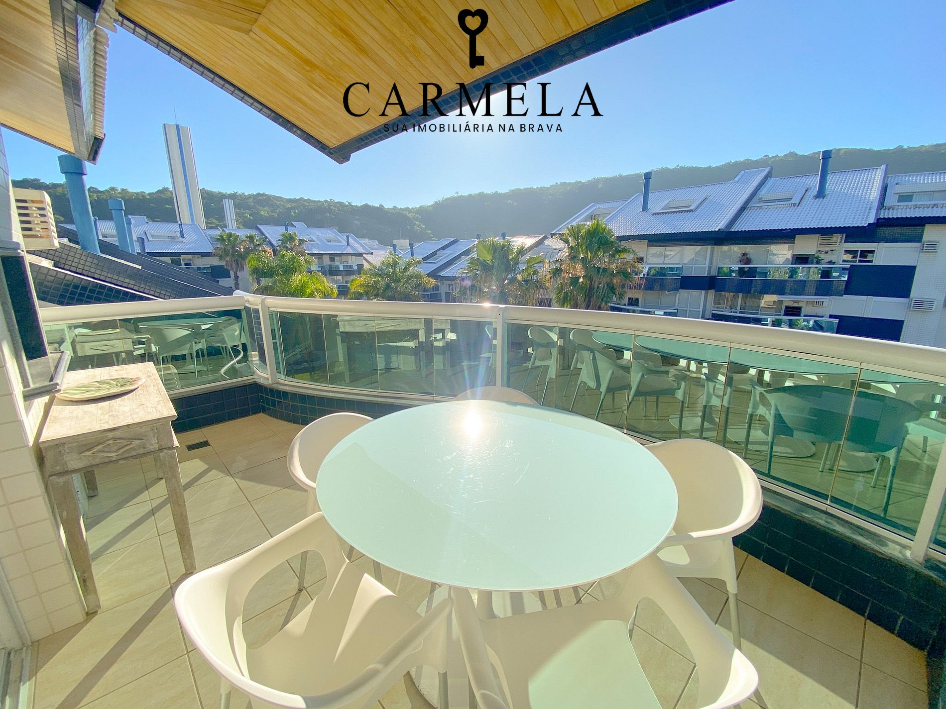 Sacada com churrasqueira e vista lateral para o mar.