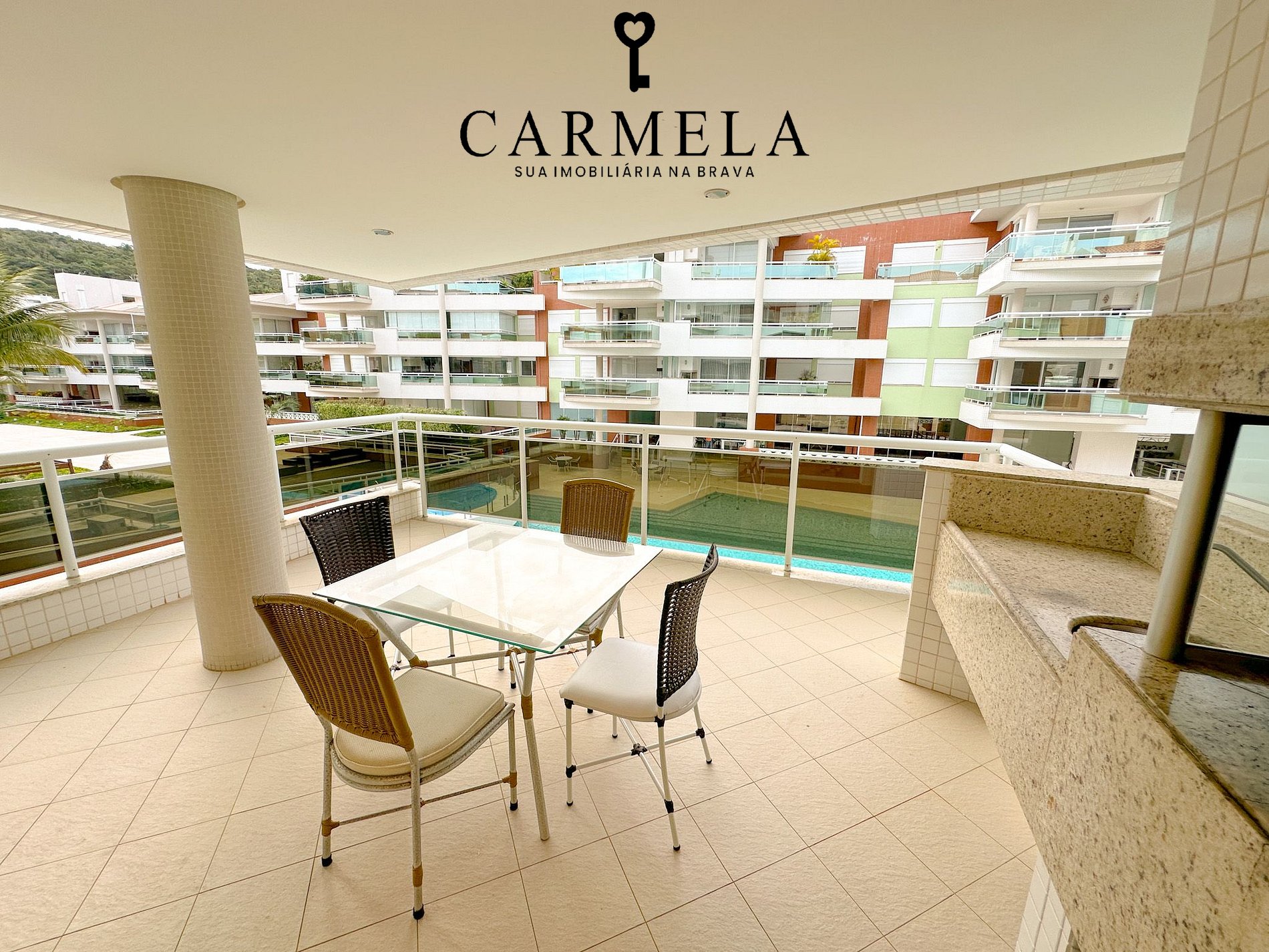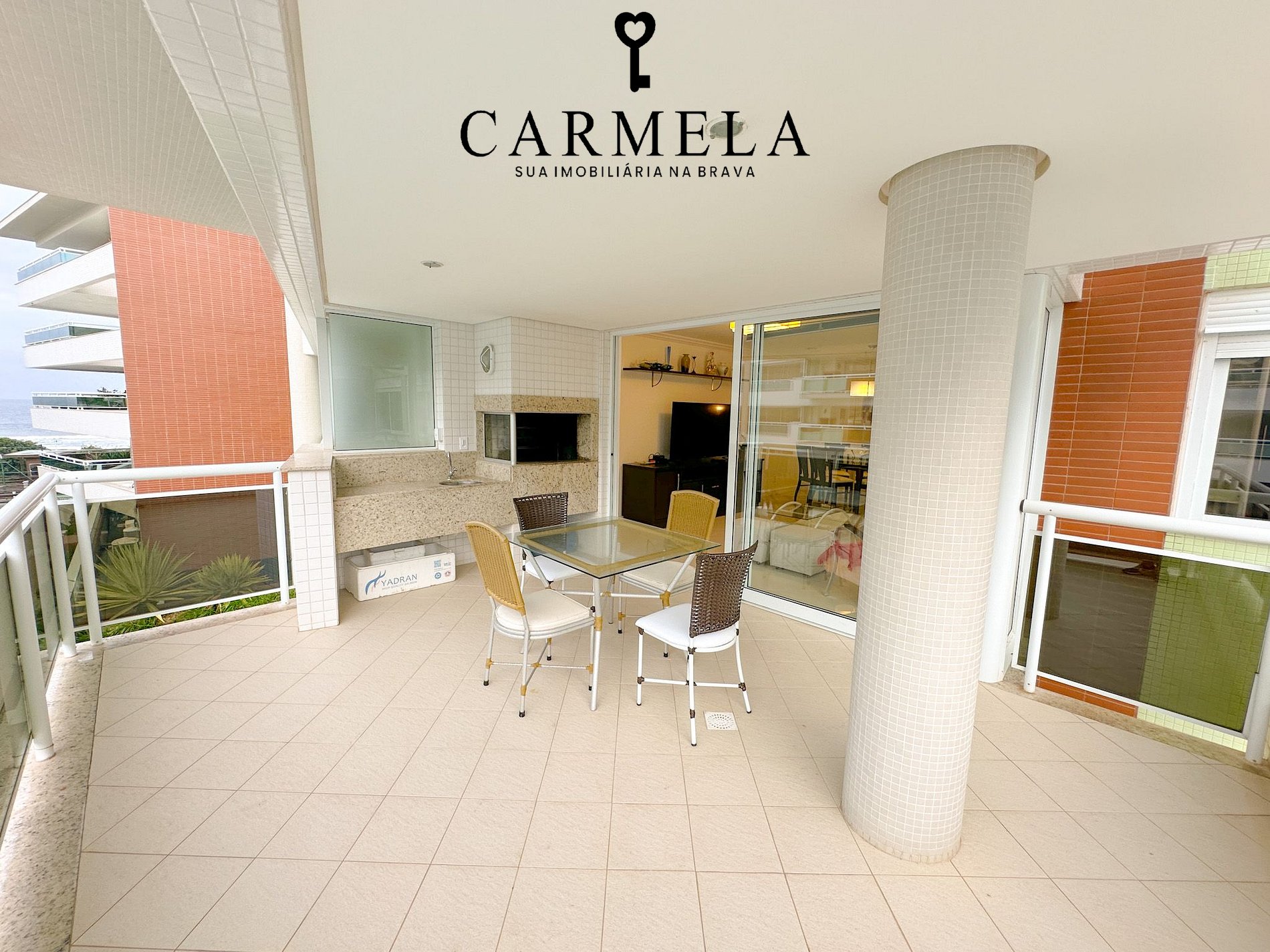 Sacada com churrasqueira e vista lateral para o mar.