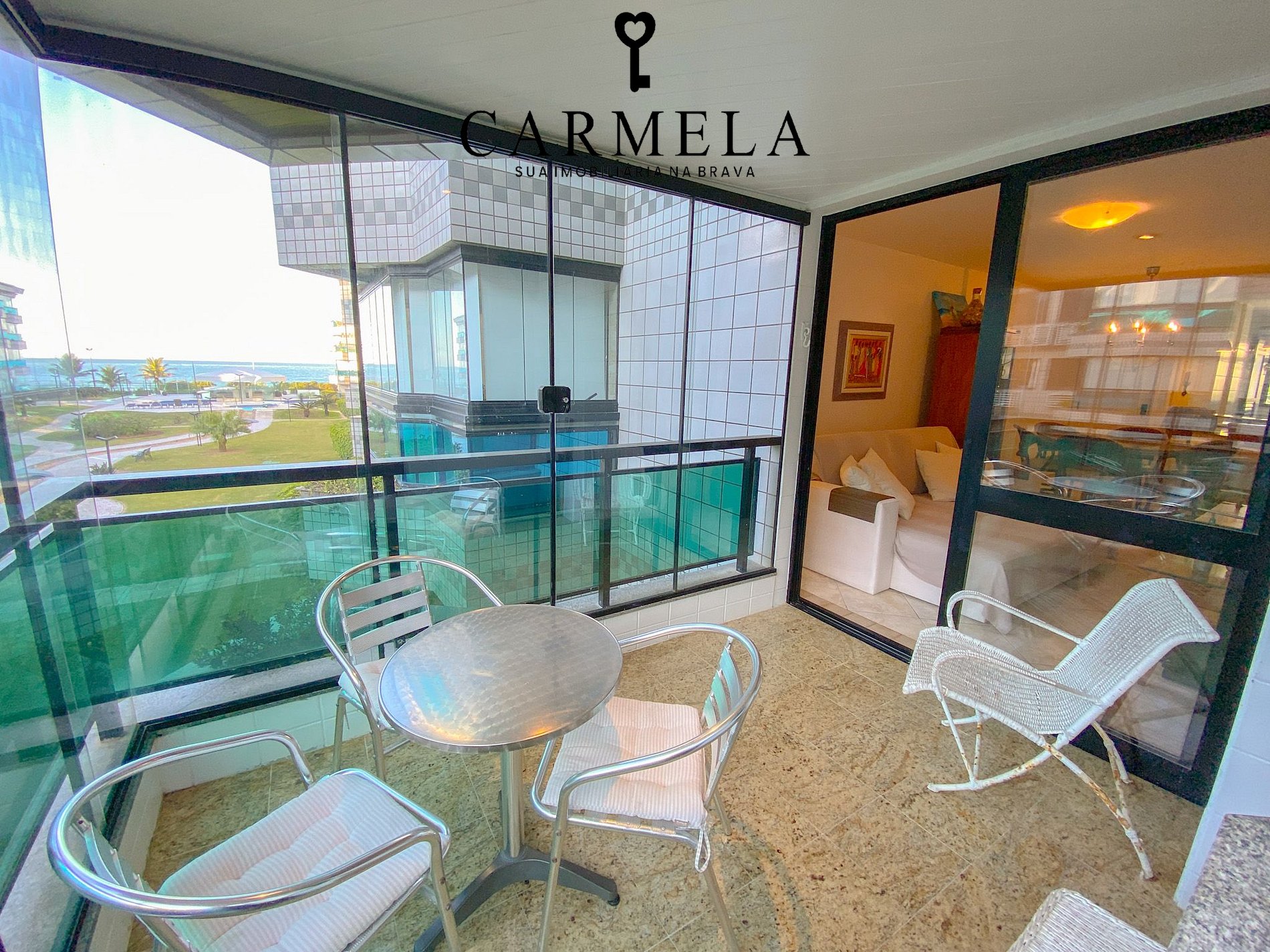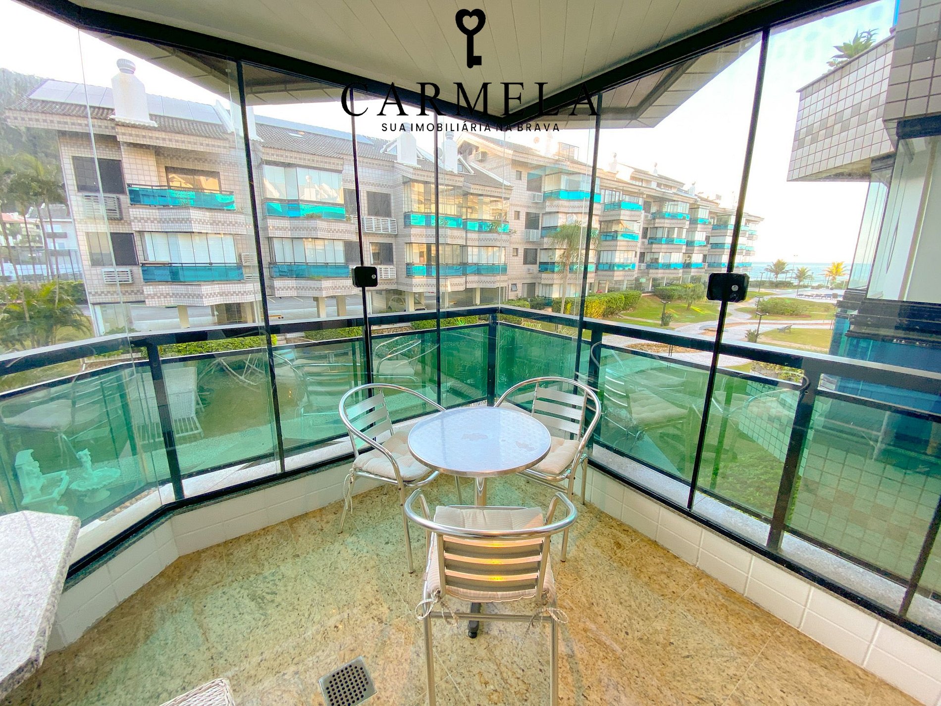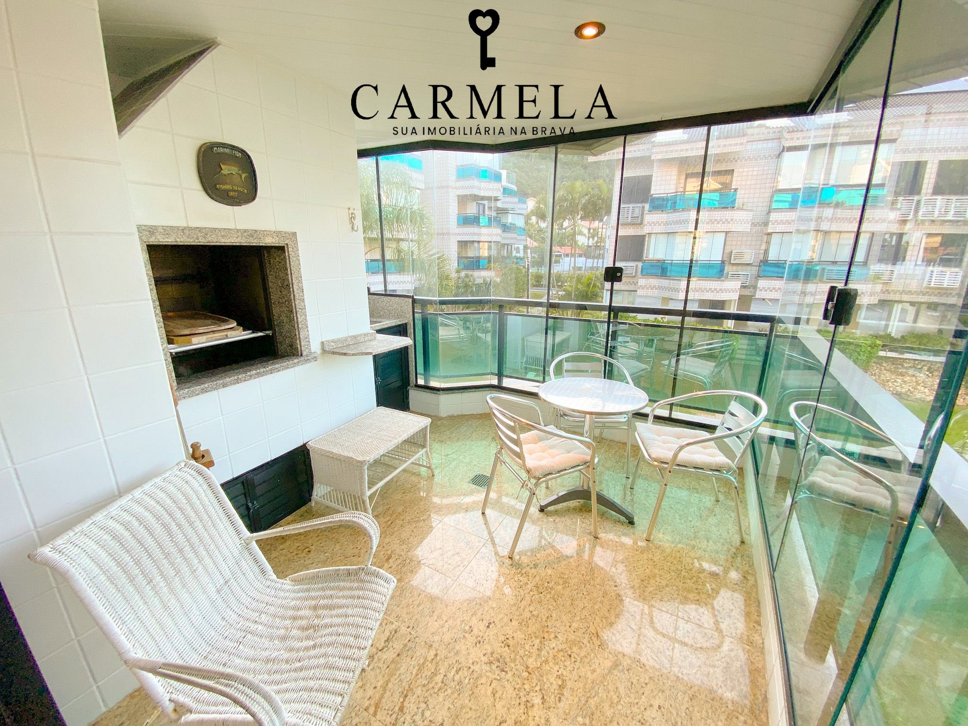 Sacada fechada com churrasqueira e vista lateral para o mar.