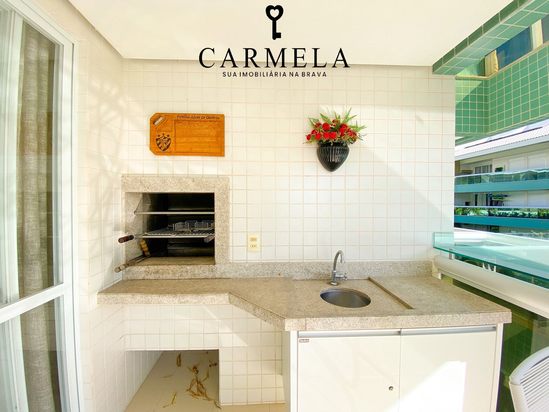 Sacada com churrasqueira e vista lateral para o mar.
