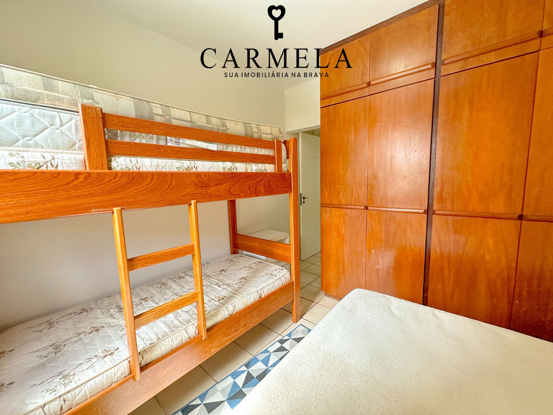Dormitório de solteiro com 1 beliche e 1 cama de casal e ar acondicionado.