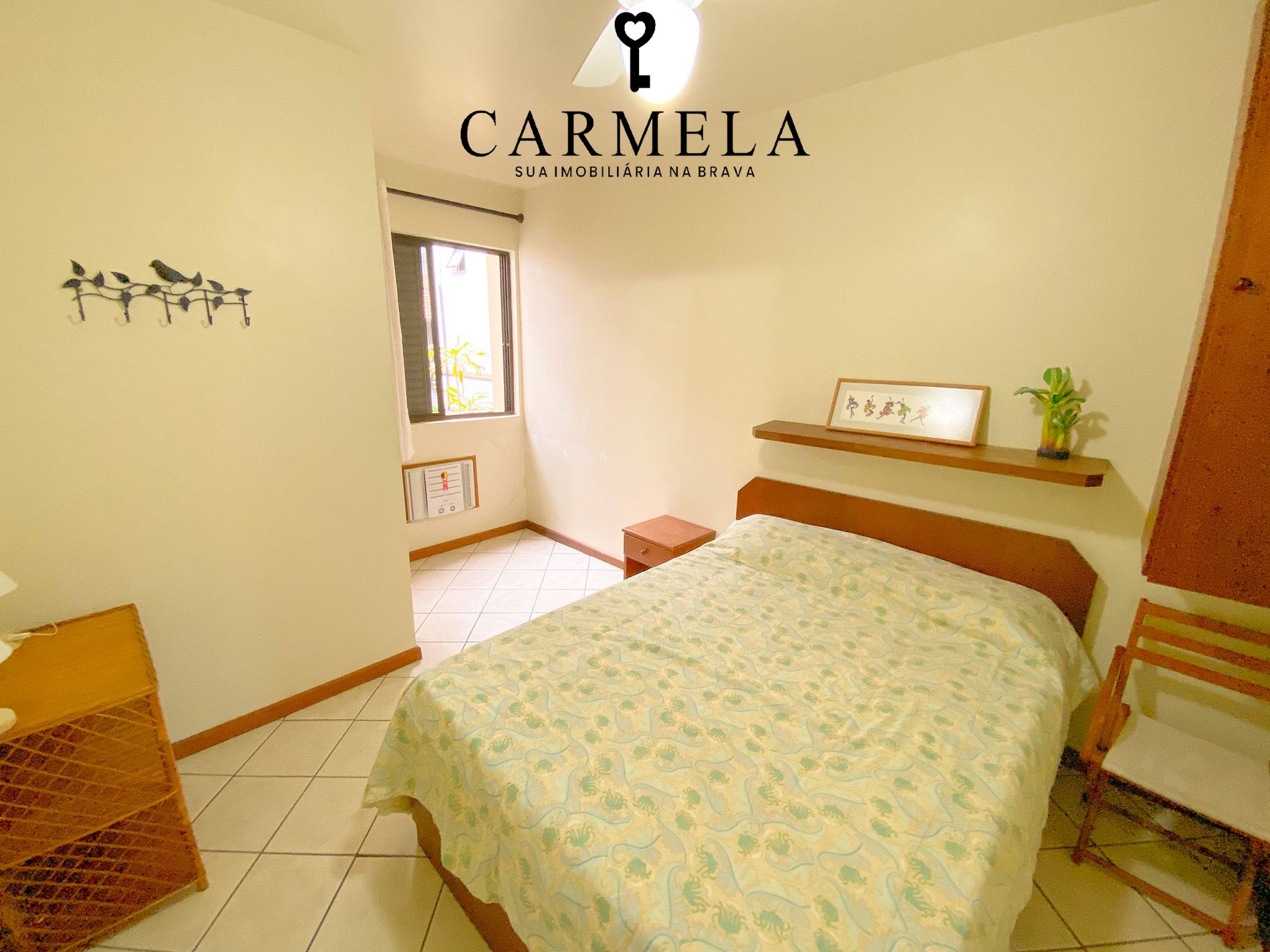 1º dormitório em suíte com cama de casal, ventilador de teto e ar condicionado.