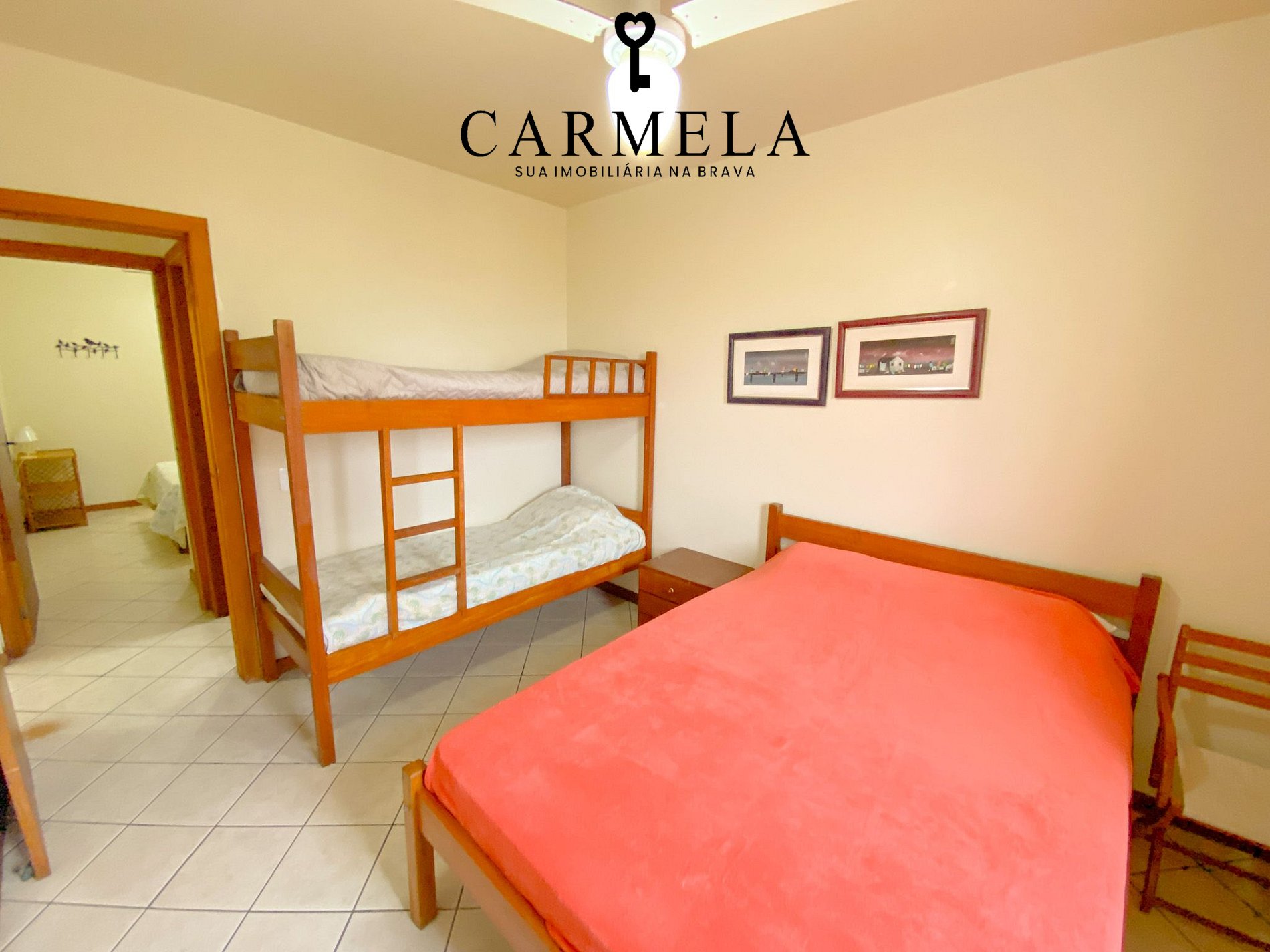 2º dormitório com 1 cama de casal, 1 beliche com ventilador de teto.