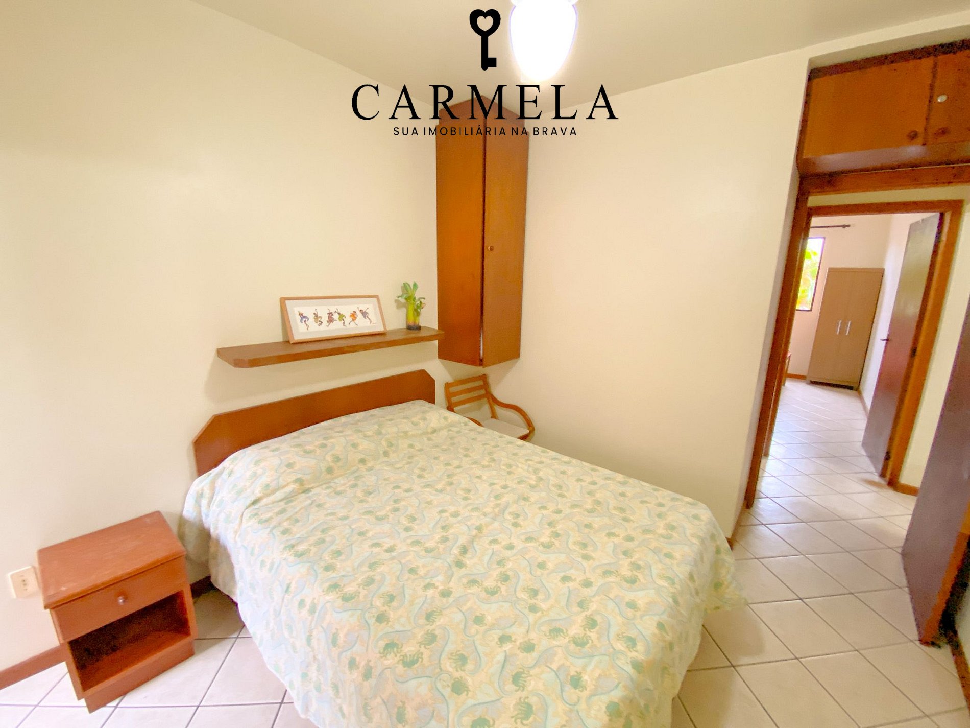 1º dormitório em suíte com cama de casal, ventilador de teto e ar condicionado.