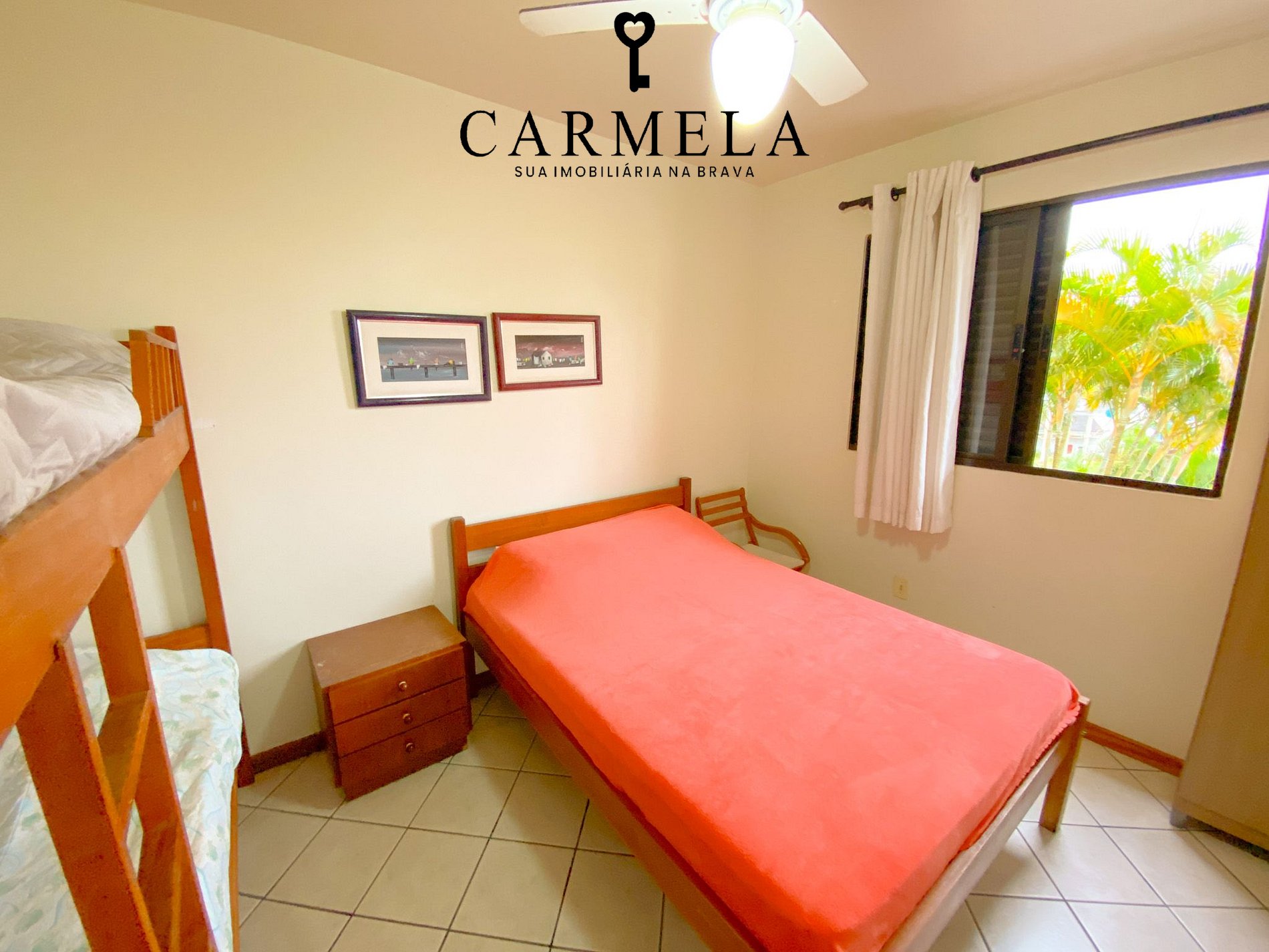 2º dormitório com 1 cama de casal, 1 beliche com ventilador de teto.