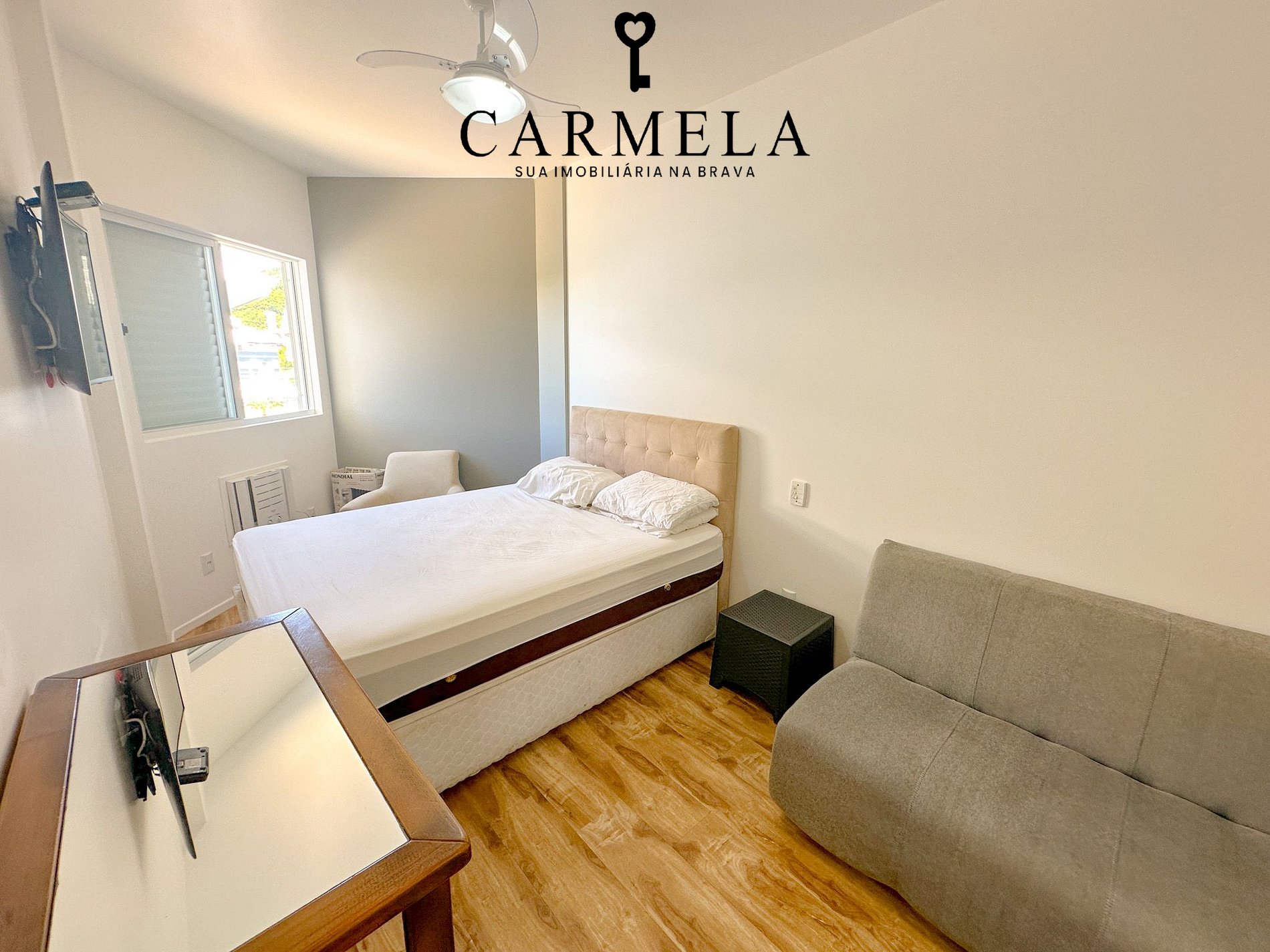 Suíte com cama de casal, e um sofá cama com ar condicionado.