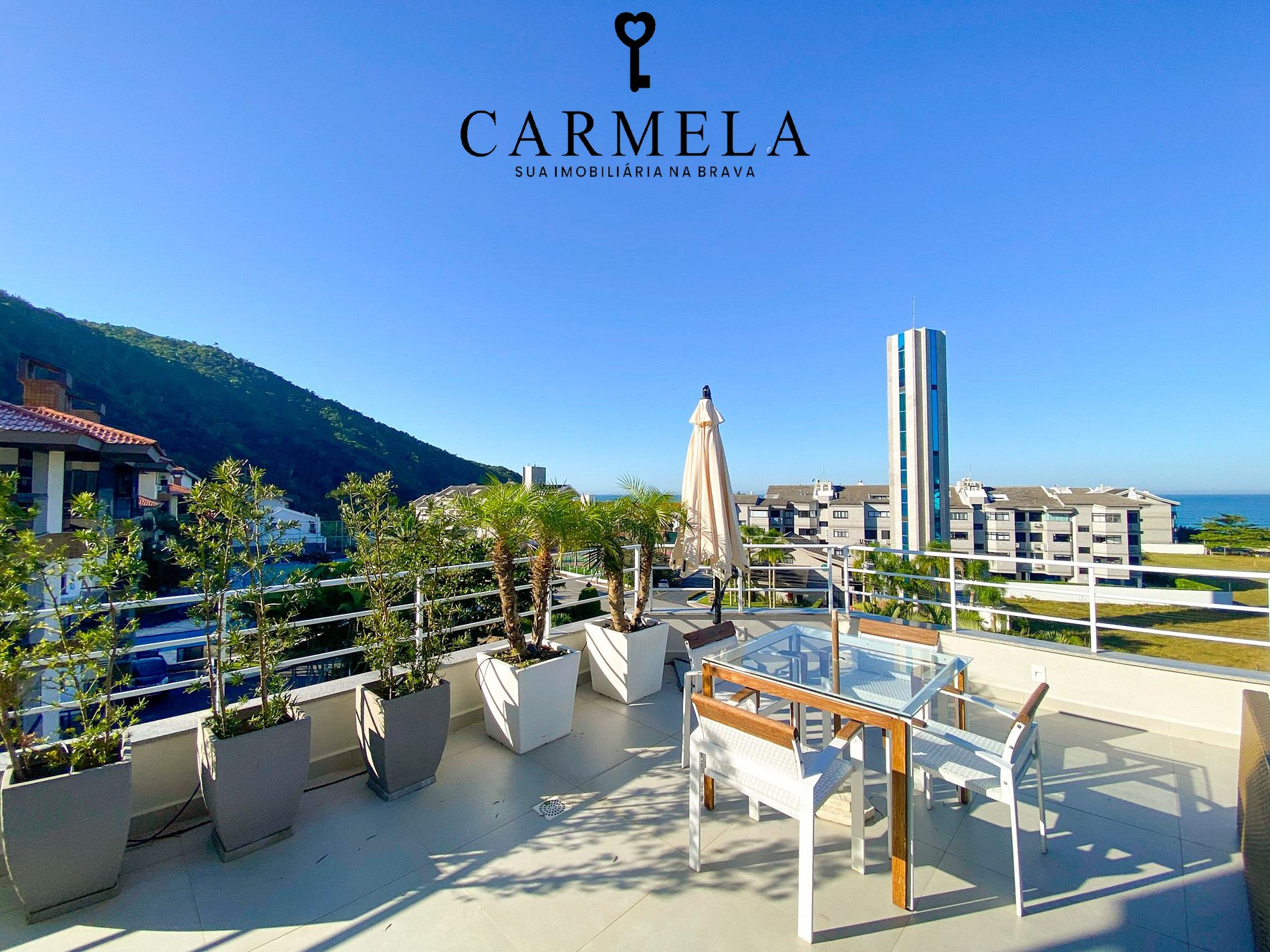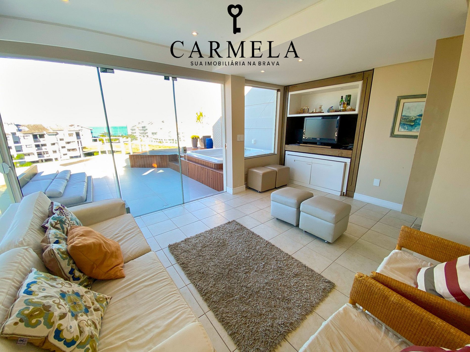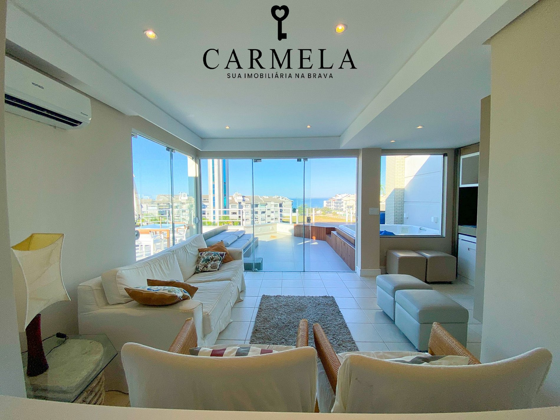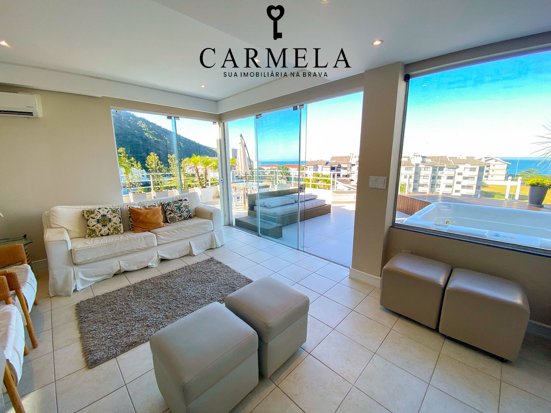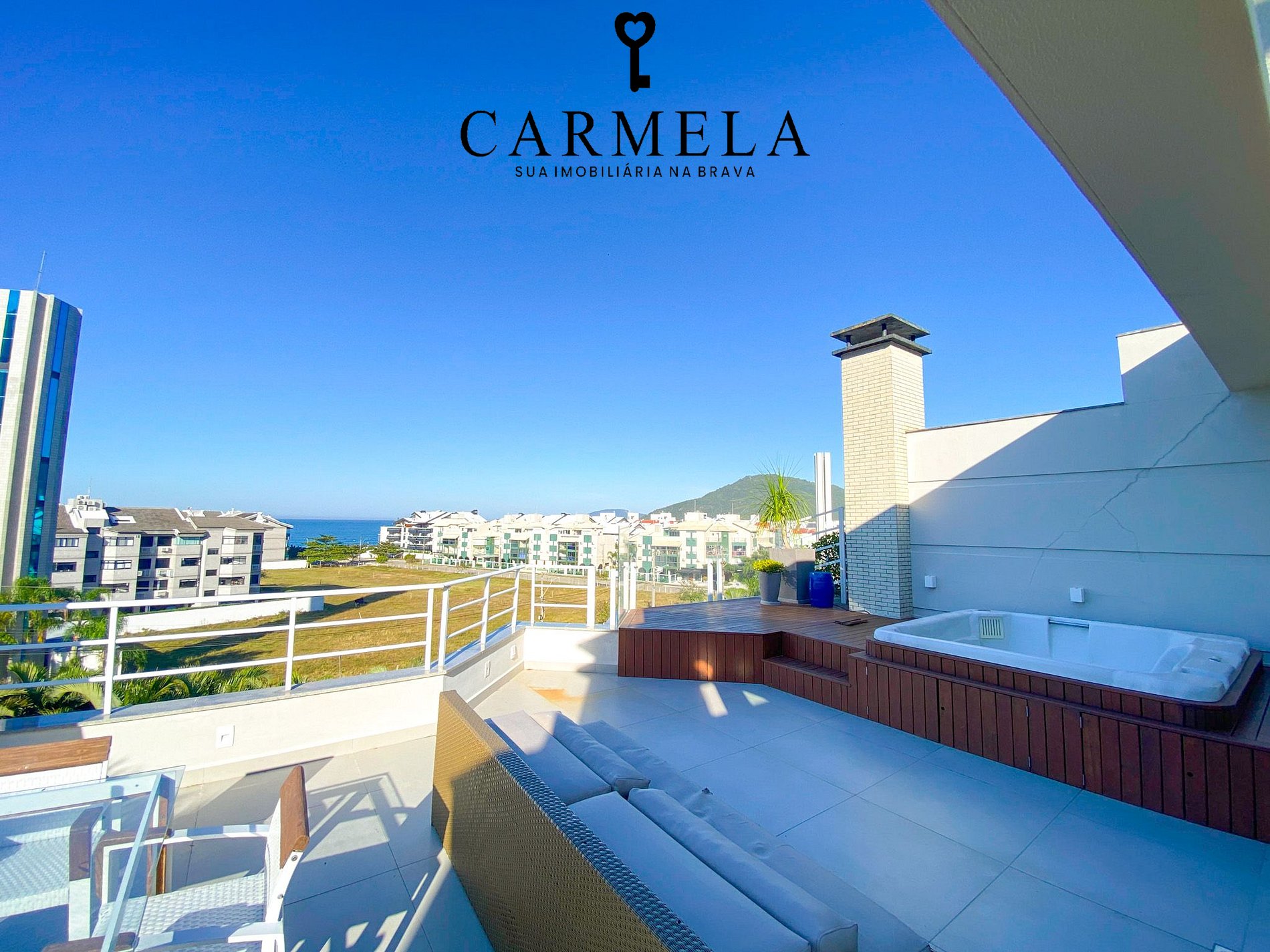 Sacada com mini piscina e vista para o mar.
