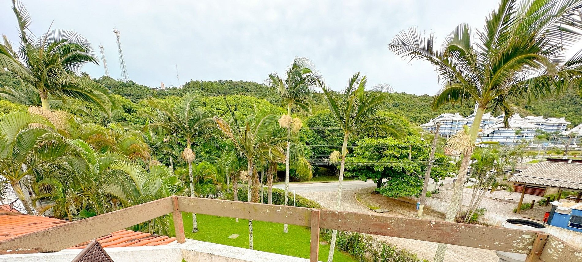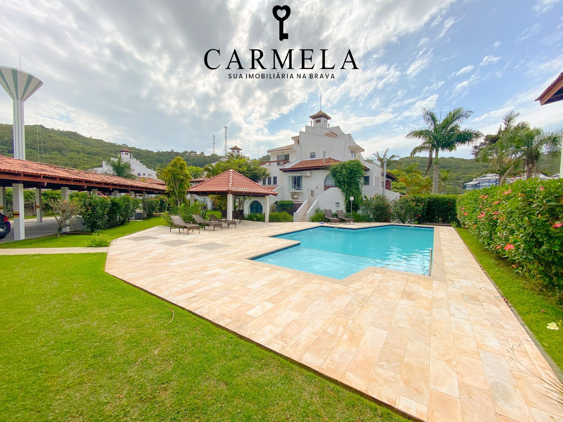 Condomínio com área verde e piscina.