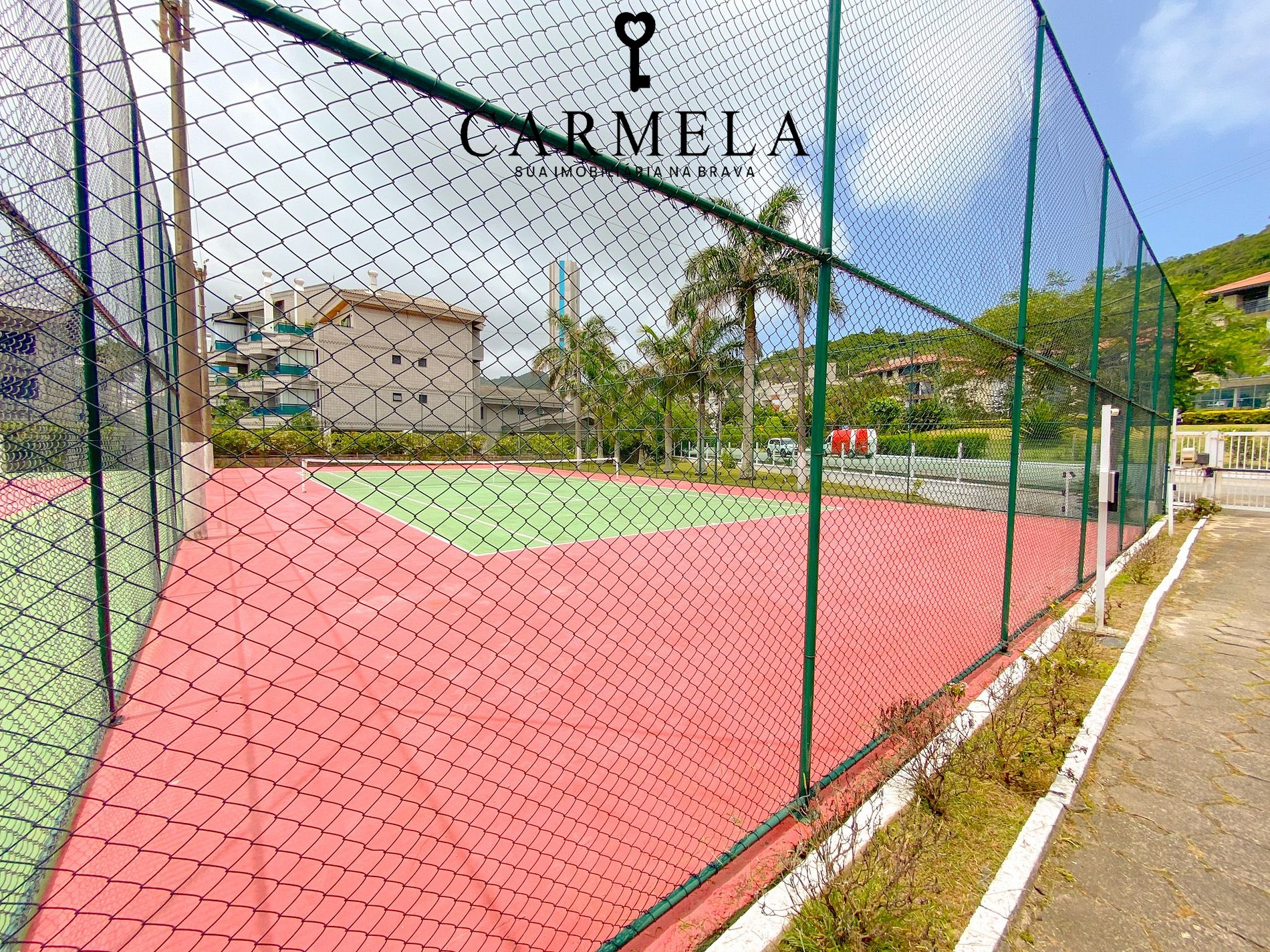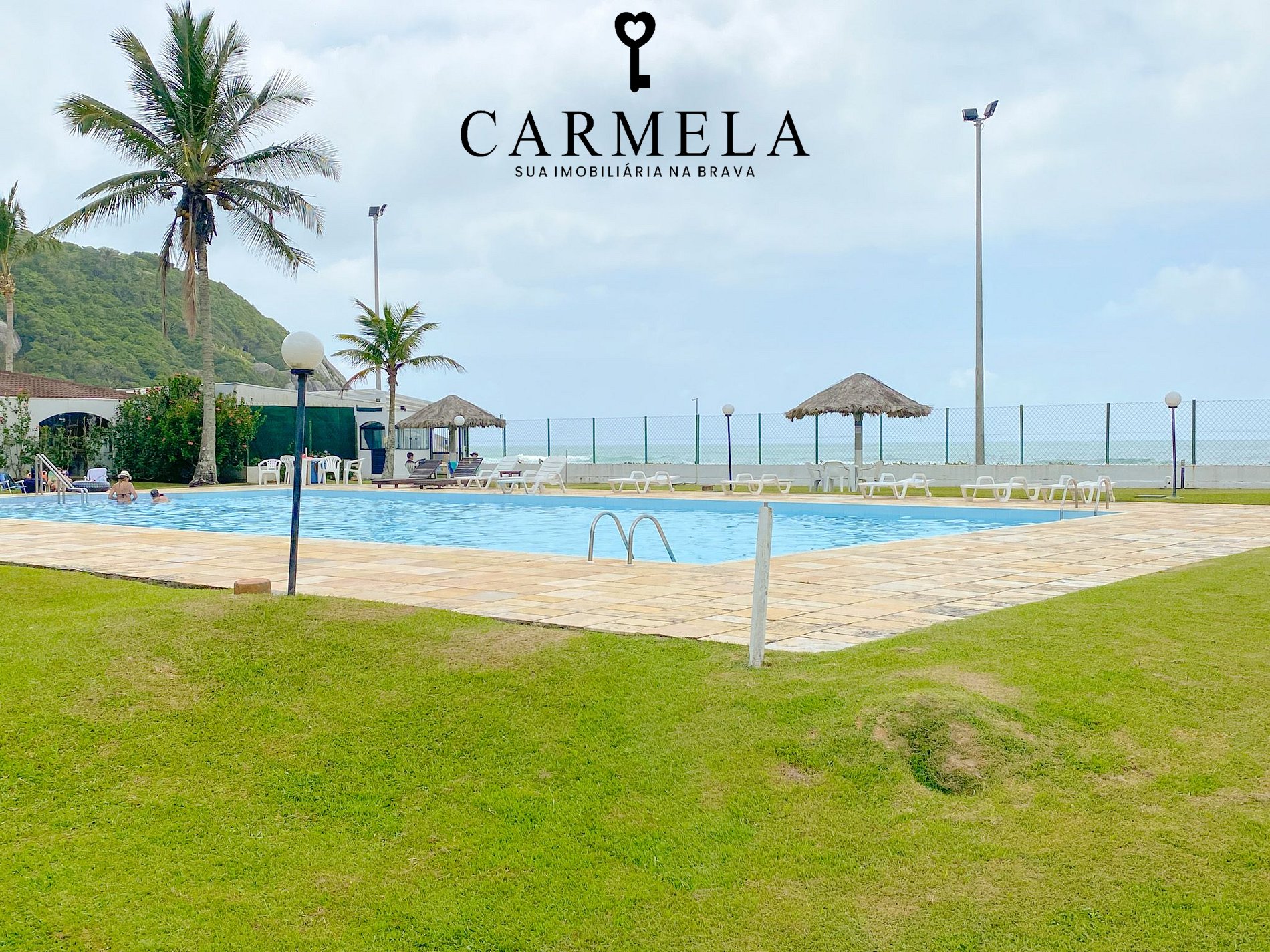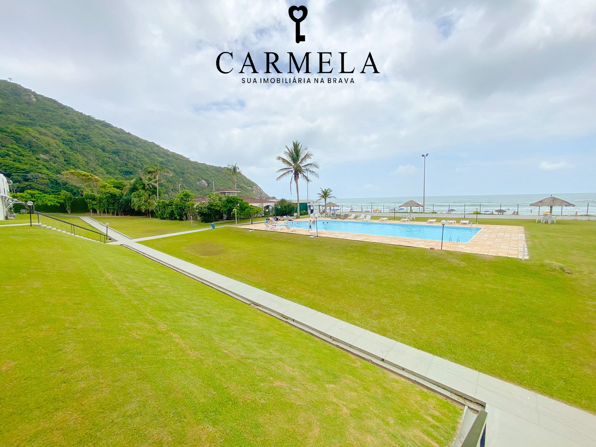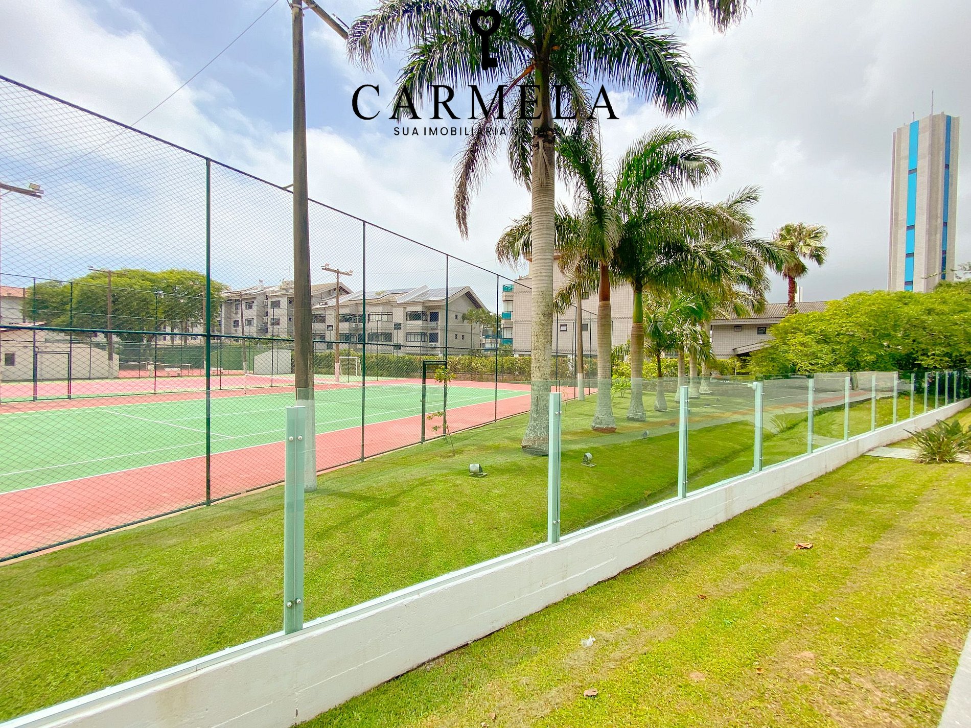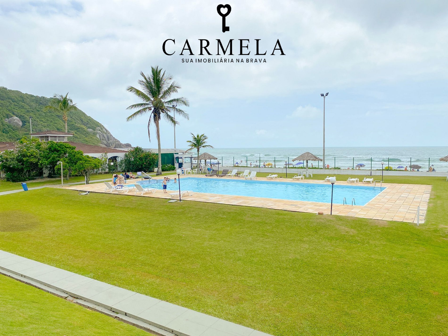 Condomínio de frente para a praia, com piscina, área verde e quadra de tênis.