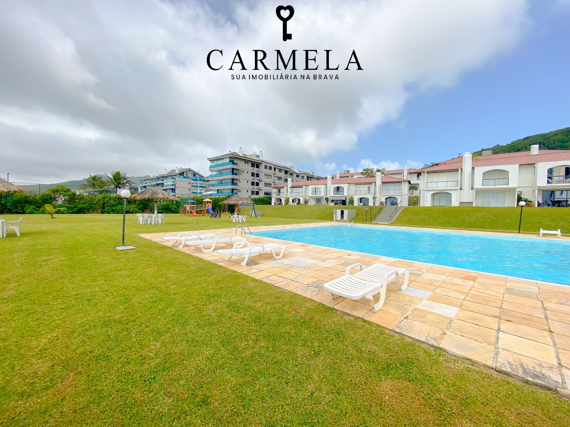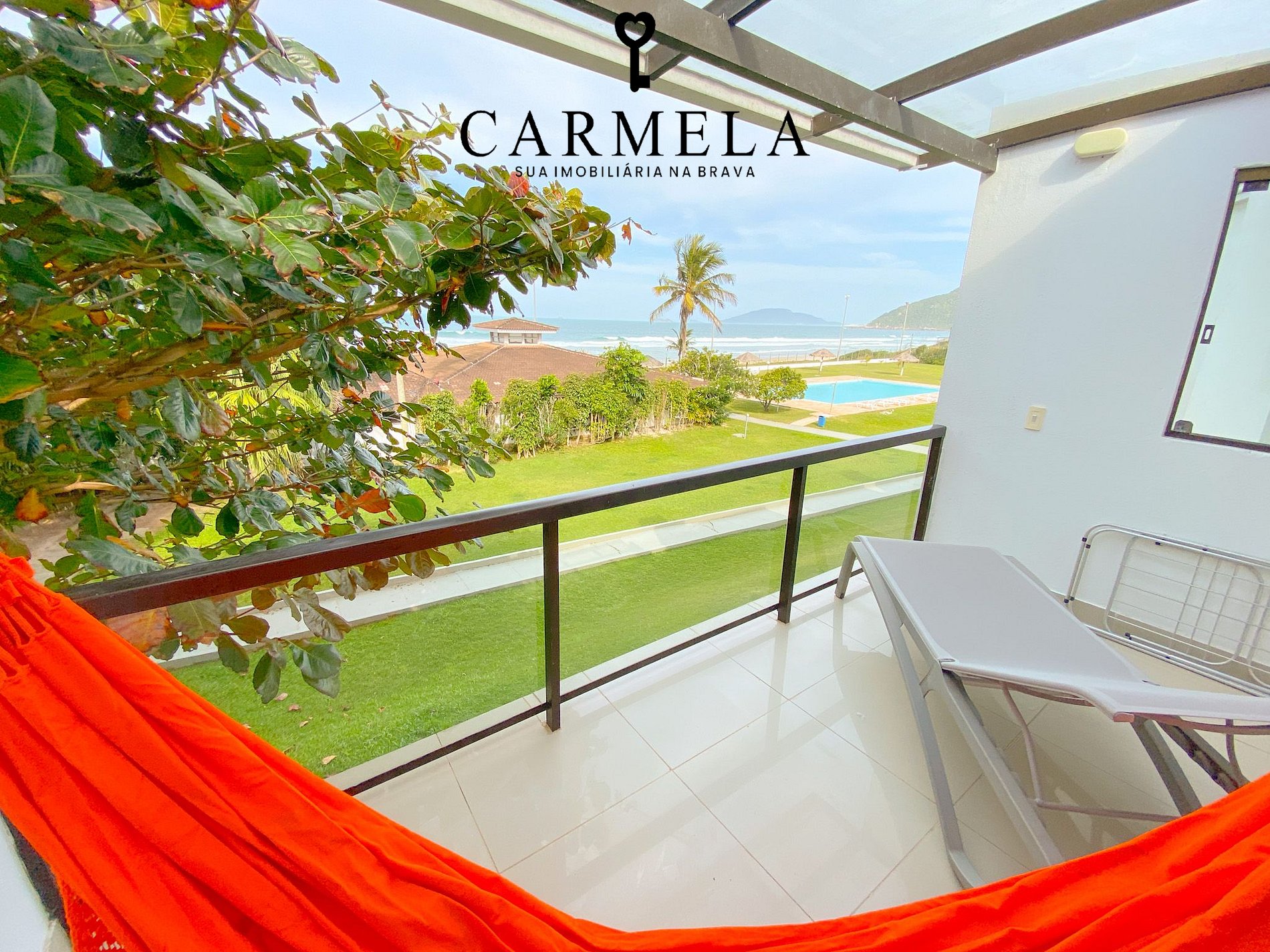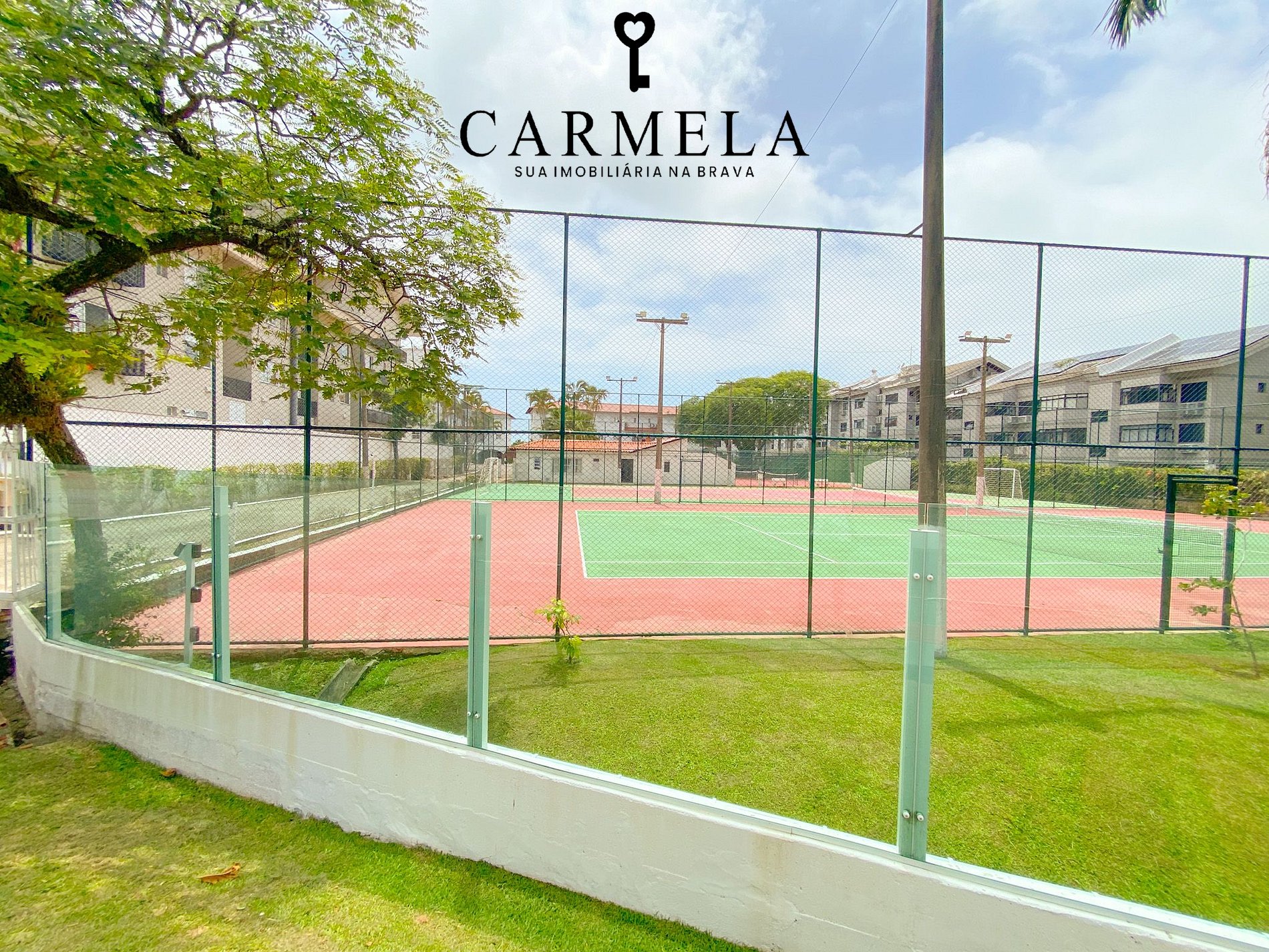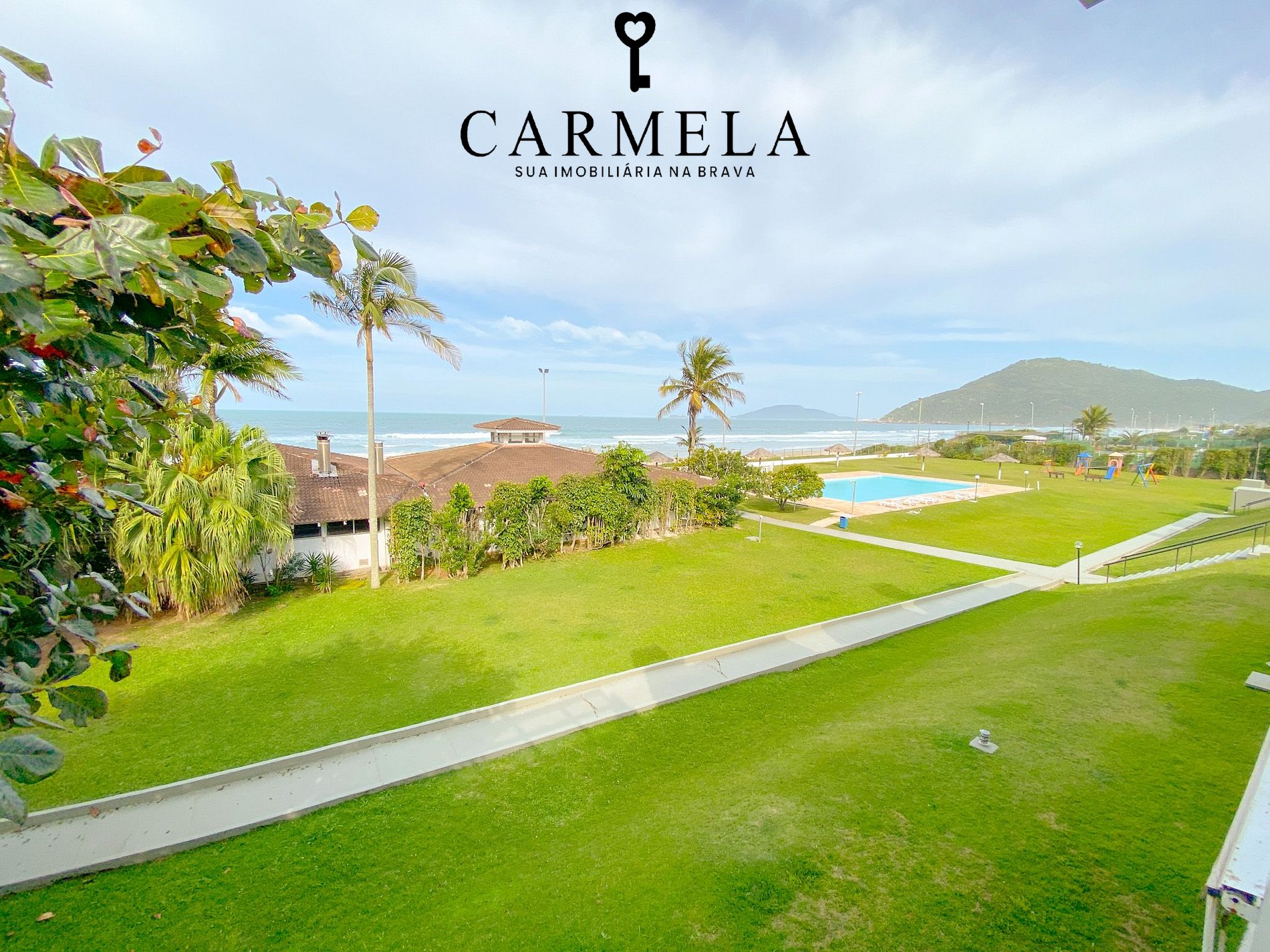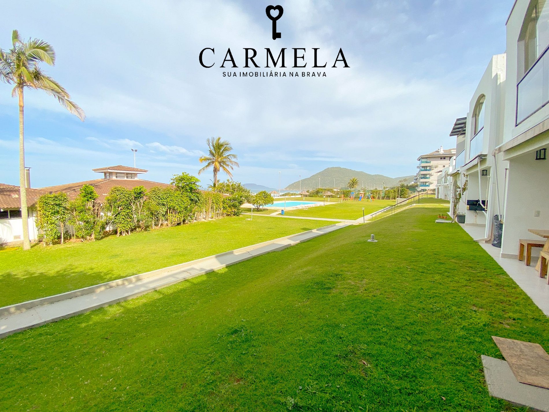 Condomínio de frente para a praia, com piscina, área verde e quadra de tênis.