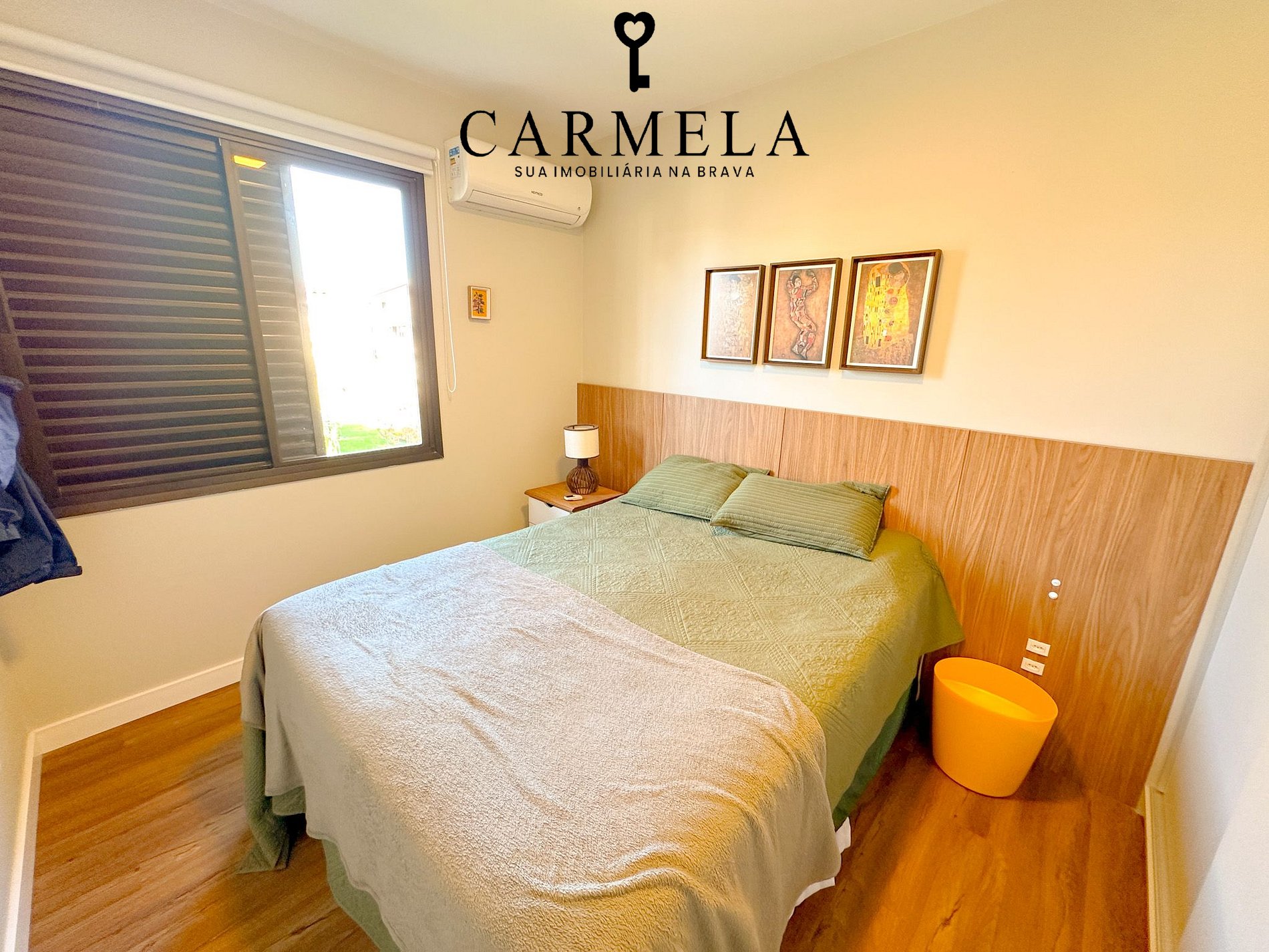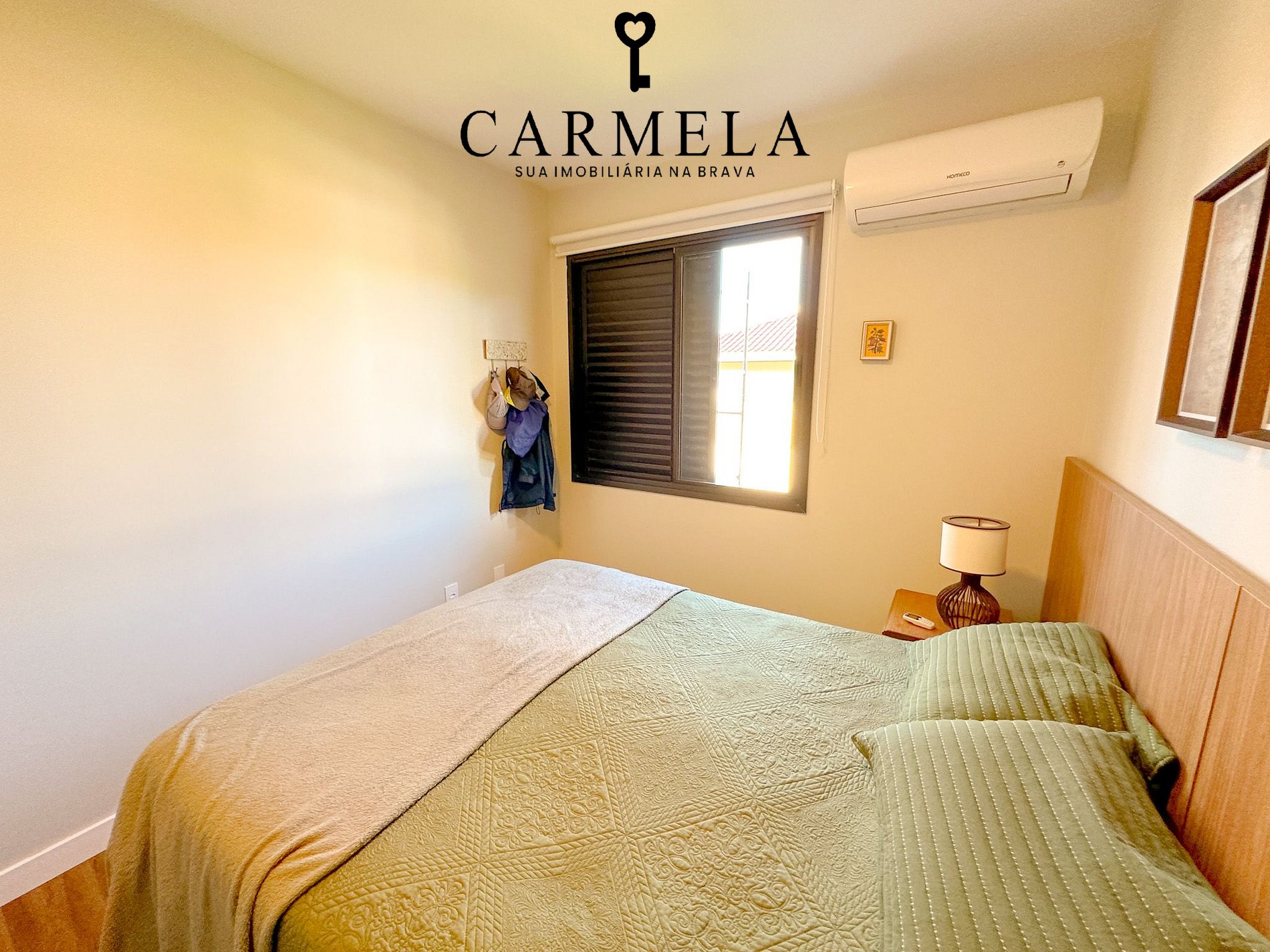 1º Dormitório suíte, com cama de casal e ar condicionado.